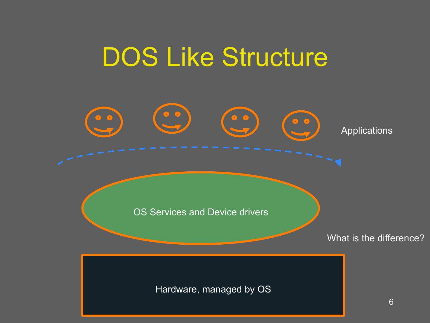 6 .DOS Like Structure Applications OS Services and Device drivers What is the difference? Hardware, managed by OS 6