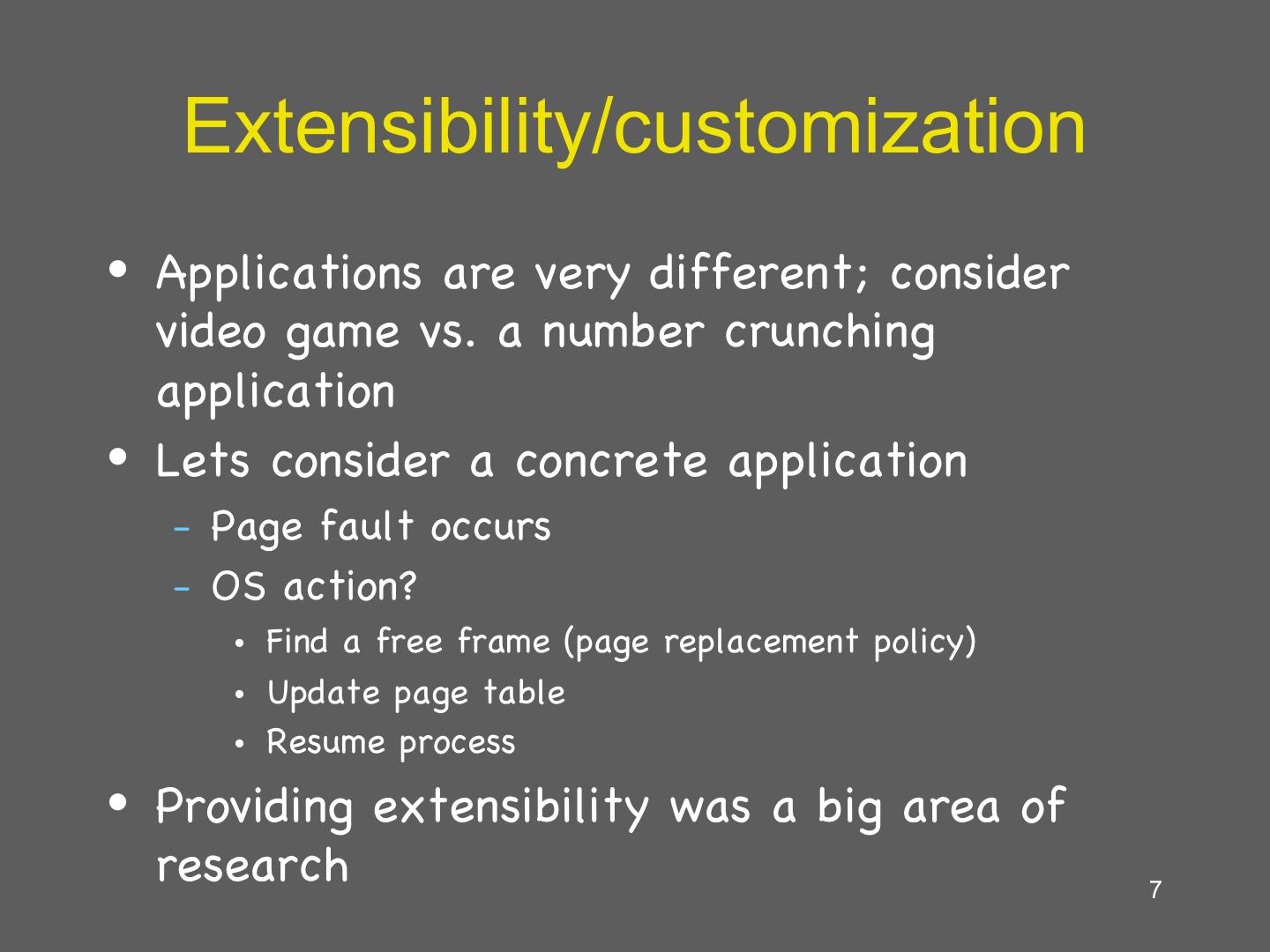 7 . Extensibility/customization • Applications are very different; consider video game vs. a number crunching application • Lets consider a concrete application – Page fault occurs – OS action? • Find a free frame (page replacement policy) • Update page table • Resume process • Providing extensibility was a big area of research 7