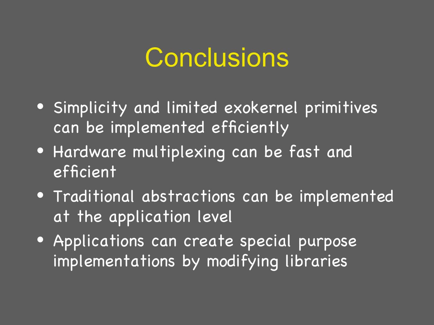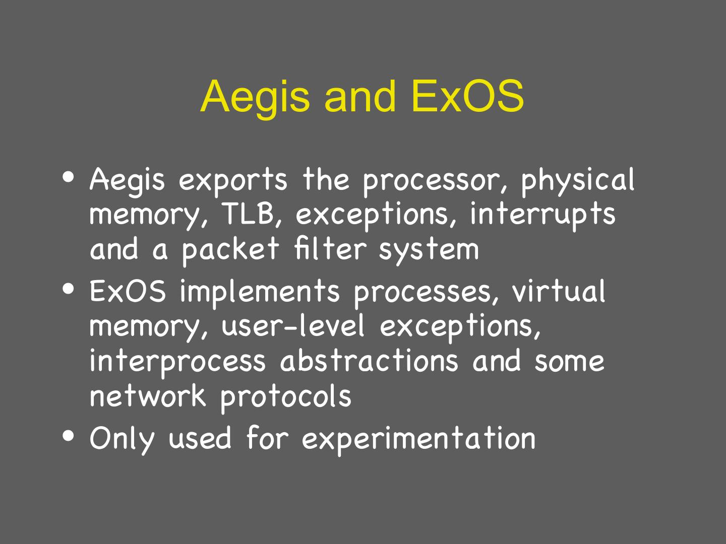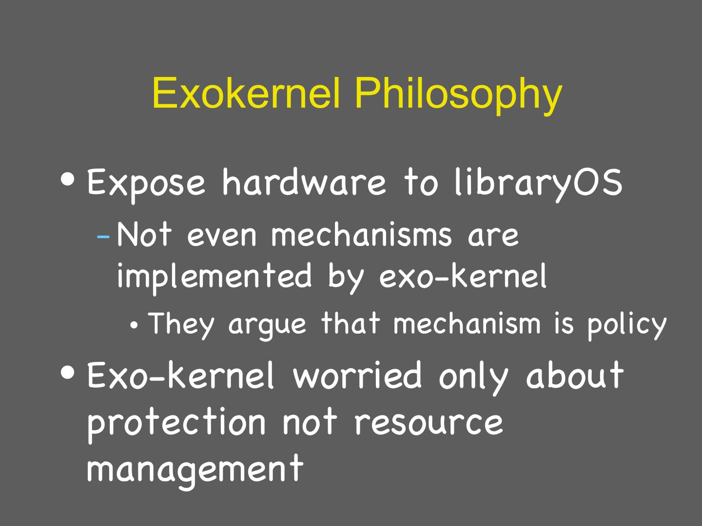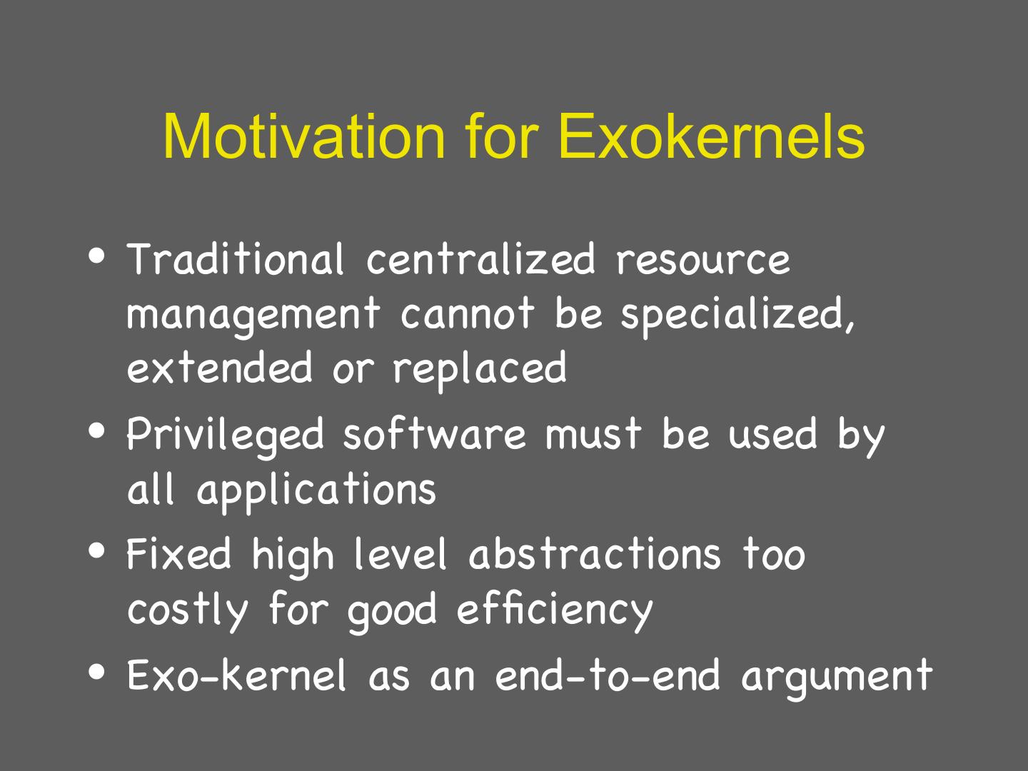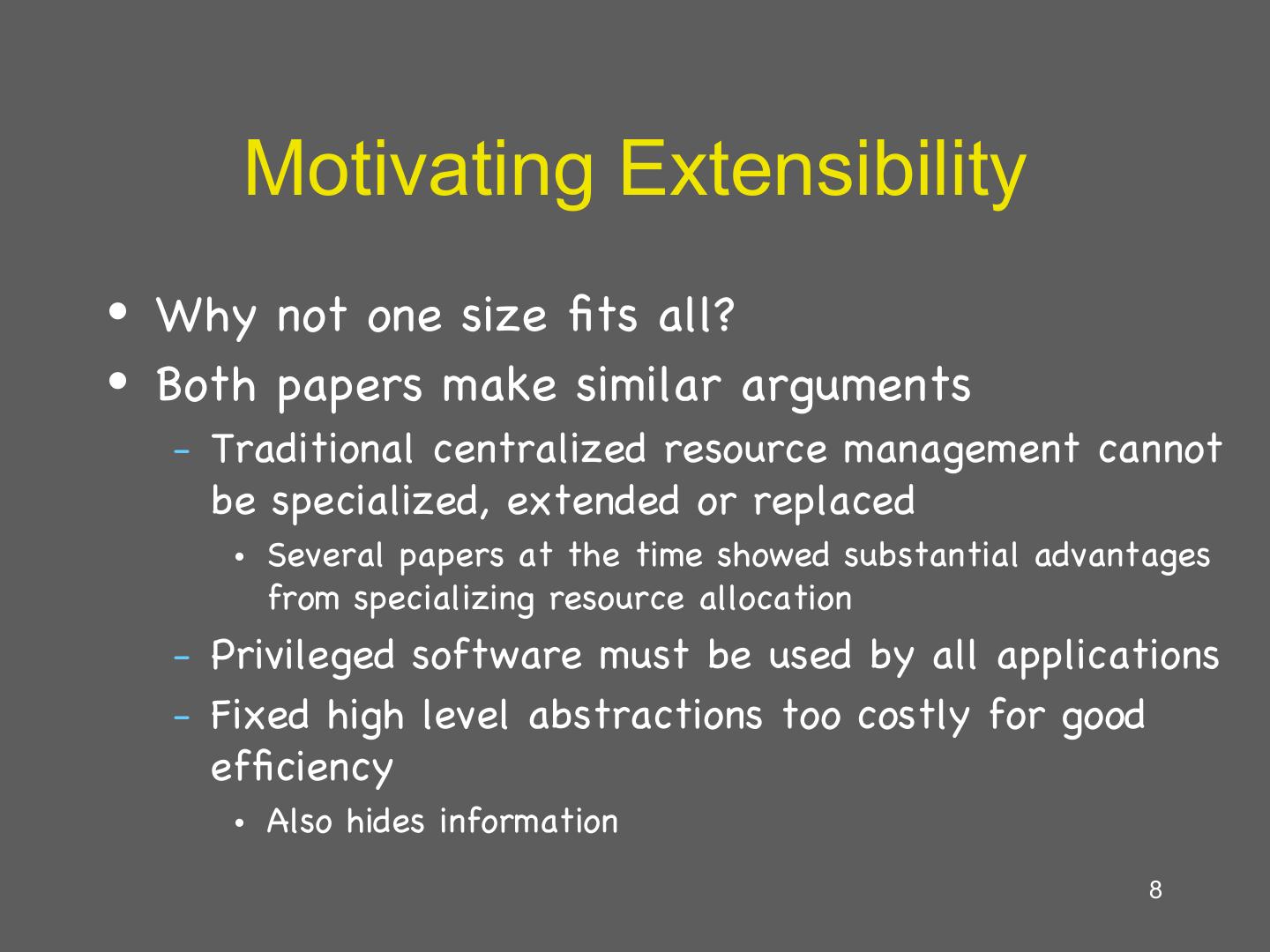 8 . Motivating Extensibility • Why not one size fits all? • Both papers make similar arguments – Traditional centralized resource management cannot be specialized, extended or replaced • Several papers at the time showed substantial advantages from specializing resource allocation – Privileged software must be used by all applications – Fixed high level abstractions too costly for good efficiency • Also hides information 8