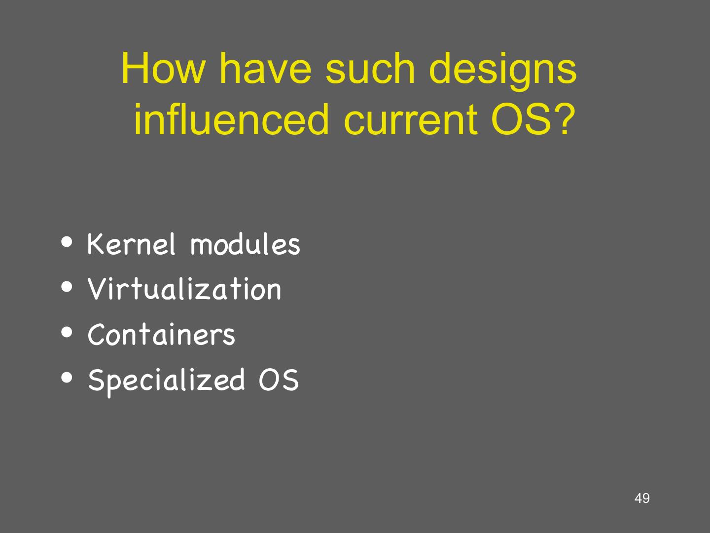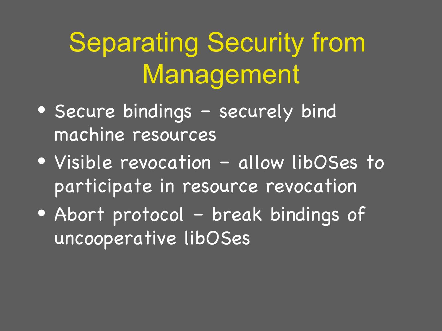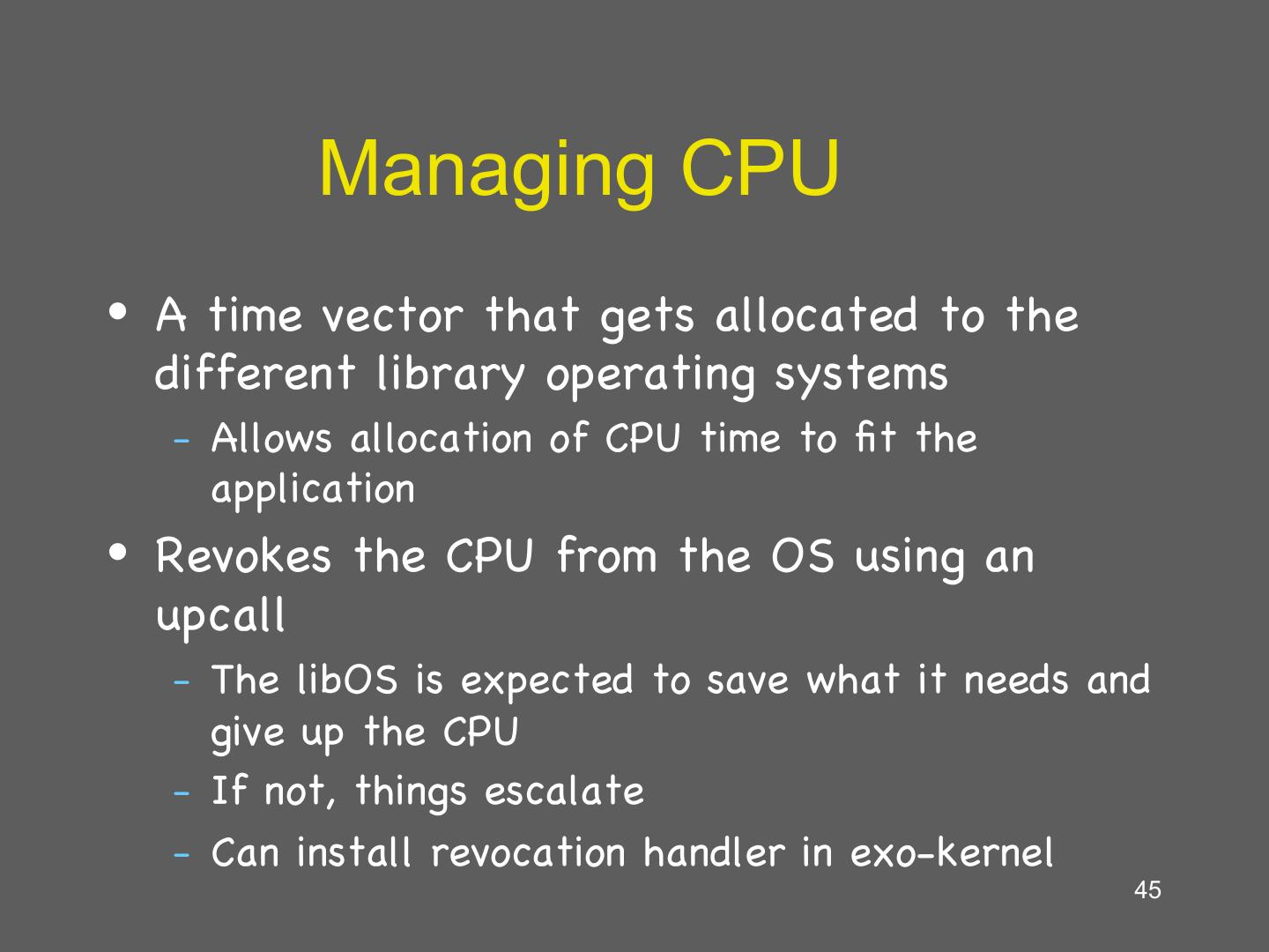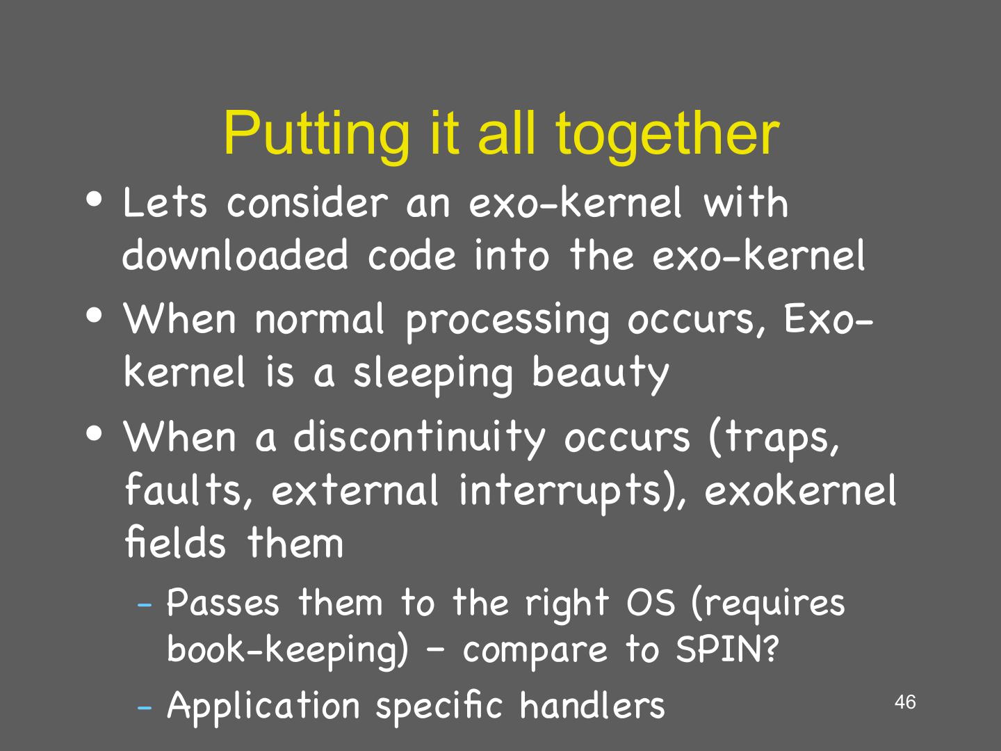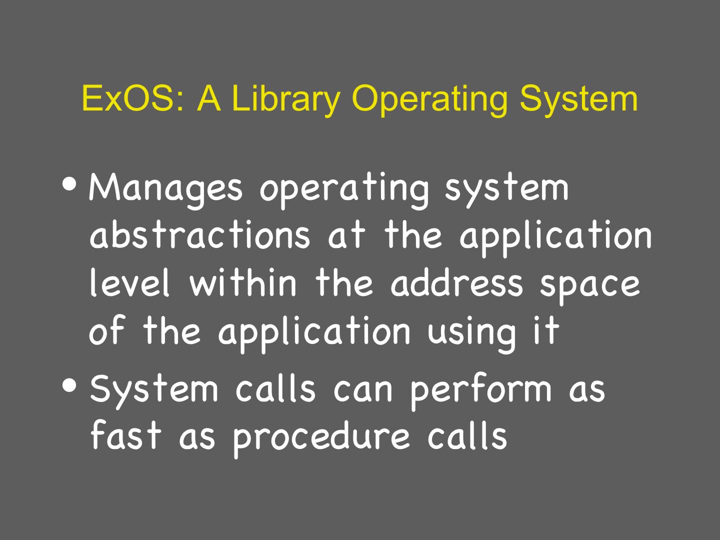 8 . Motivating Extensibility • Why not one size fits all? • Both papers make similar arguments – Traditional centralized resource management cannot be specialized, extended or replaced • Several papers at the time showed substantial advantages from specializing resource allocation – Privileged software must be used by all applications – Fixed high level abstractions too costly for good efficiency • Also hides information 8