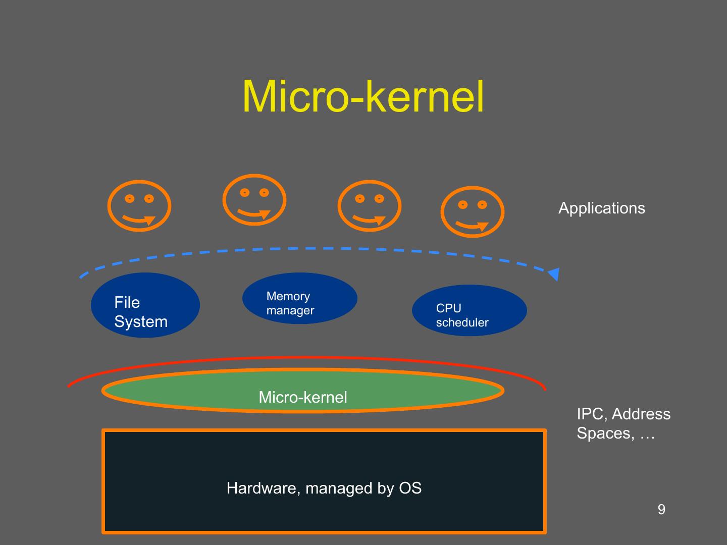 9 . Micro-kernel Applications Memory File manager CPU System scheduler Micro-kernel IPC, Address Spaces, … Hardware, managed by OS 9
