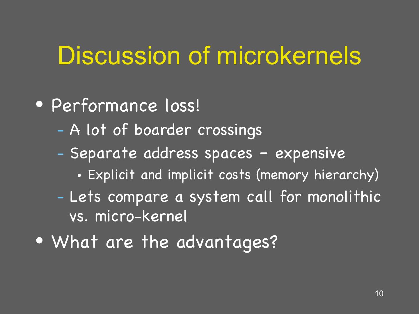 10 . Discussion of microkernels • Performance loss! – A lot of boarder crossings – Separate address spaces – expensive • Explicit and implicit costs (memory hierarchy) – Letscompare a system call for monolithic vs. micro-kernel • What are the advantages? 10