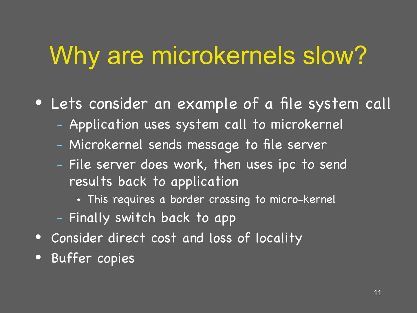 11 . Why are microkernels slow? • Lets consider an example of a file system call – Application uses system call to microkernel – Microkernel sends message to file server – File server does work, then uses ipc to send results back to application • This requires a border crossing to micro-kernel – Finally switch back to app • Consider direct cost and loss of locality • Buffer copies 11