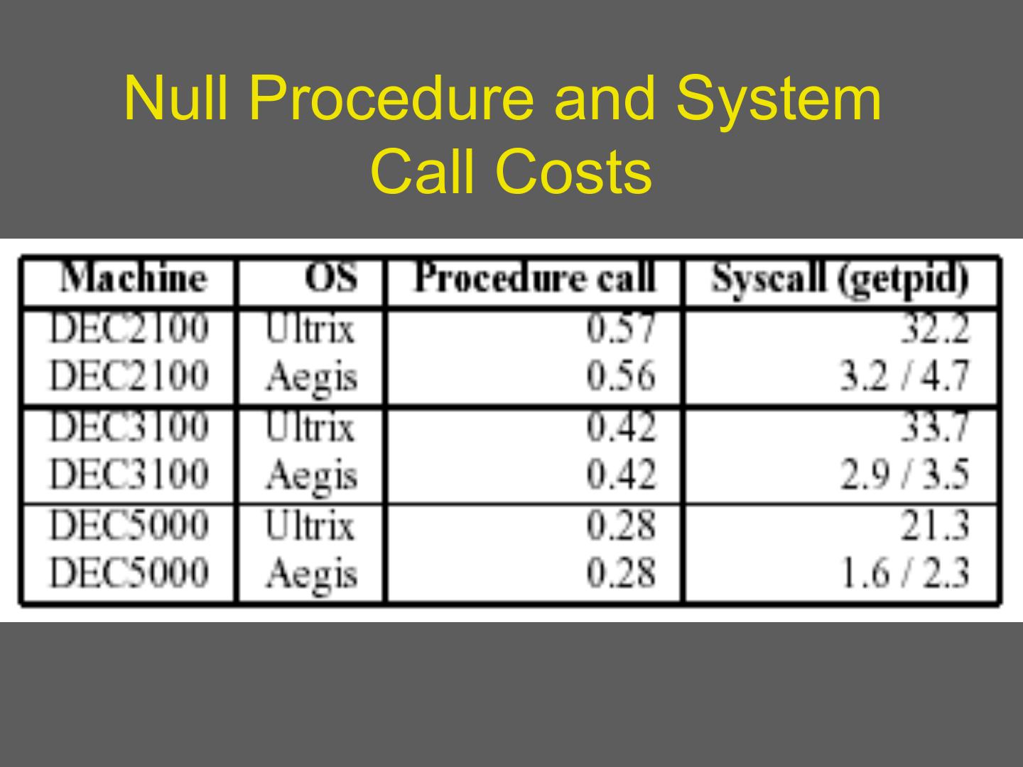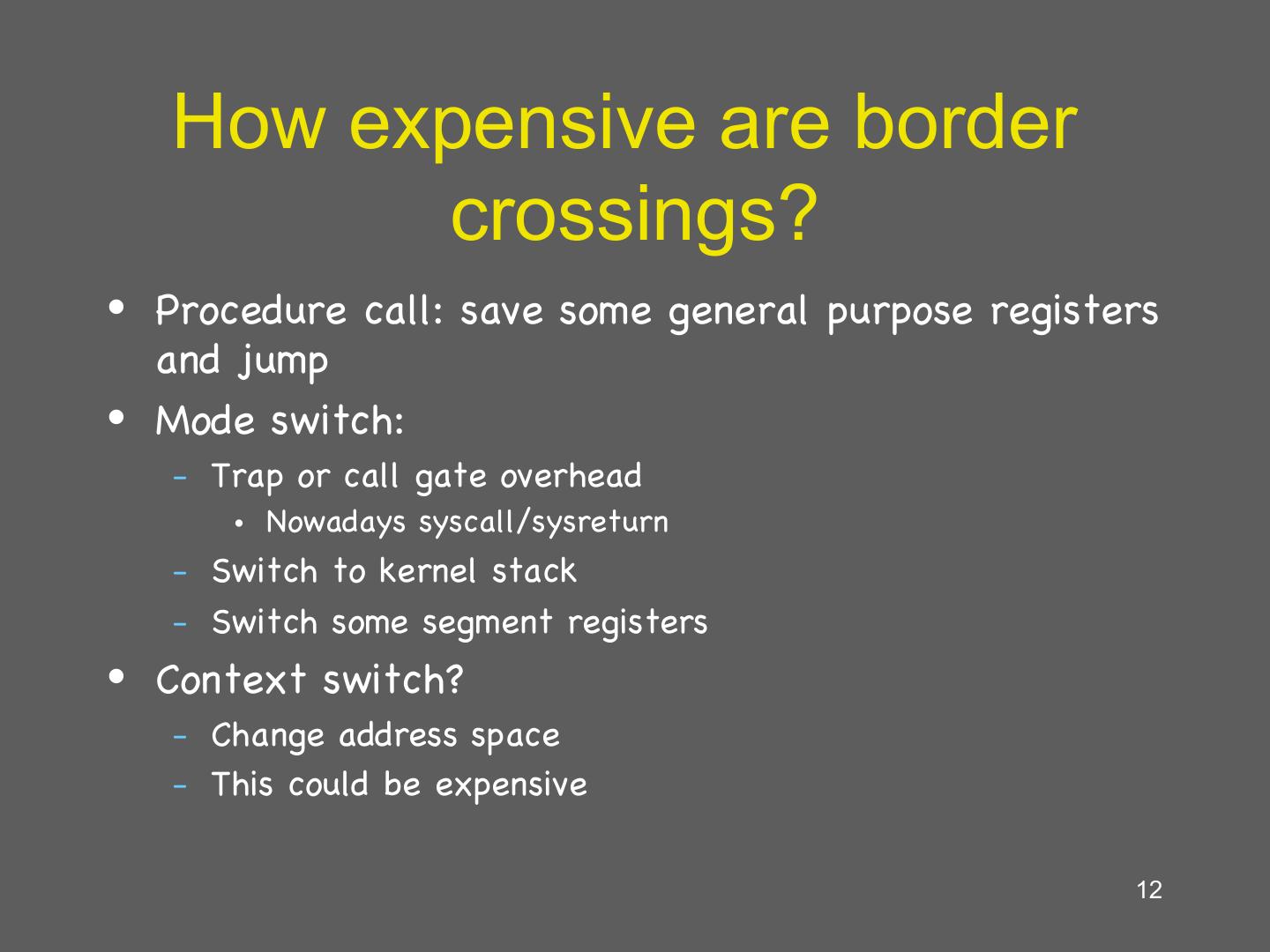 12 . How expensive are border crossings? • Procedure call: save some general purpose registers and jump • Mode switch: – Trap or call gate overhead • Nowadays syscall/sysreturn – Switch to kernel stack – Switch some segment registers • Context switch? – Change address space – This could be expensive 12