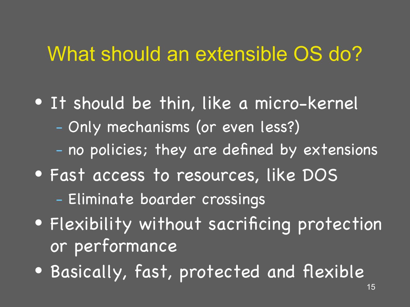 15 . What should an extensible OS do? • It should be thin, like a micro-kernel – Only mechanisms (or even less?) – no policies; they are defined by extensions • Fast access to resources, like DOS – Eliminate boarder crossings • Flexibility without sacrificing protection or performance • Basically, fast, protected and flexible 15