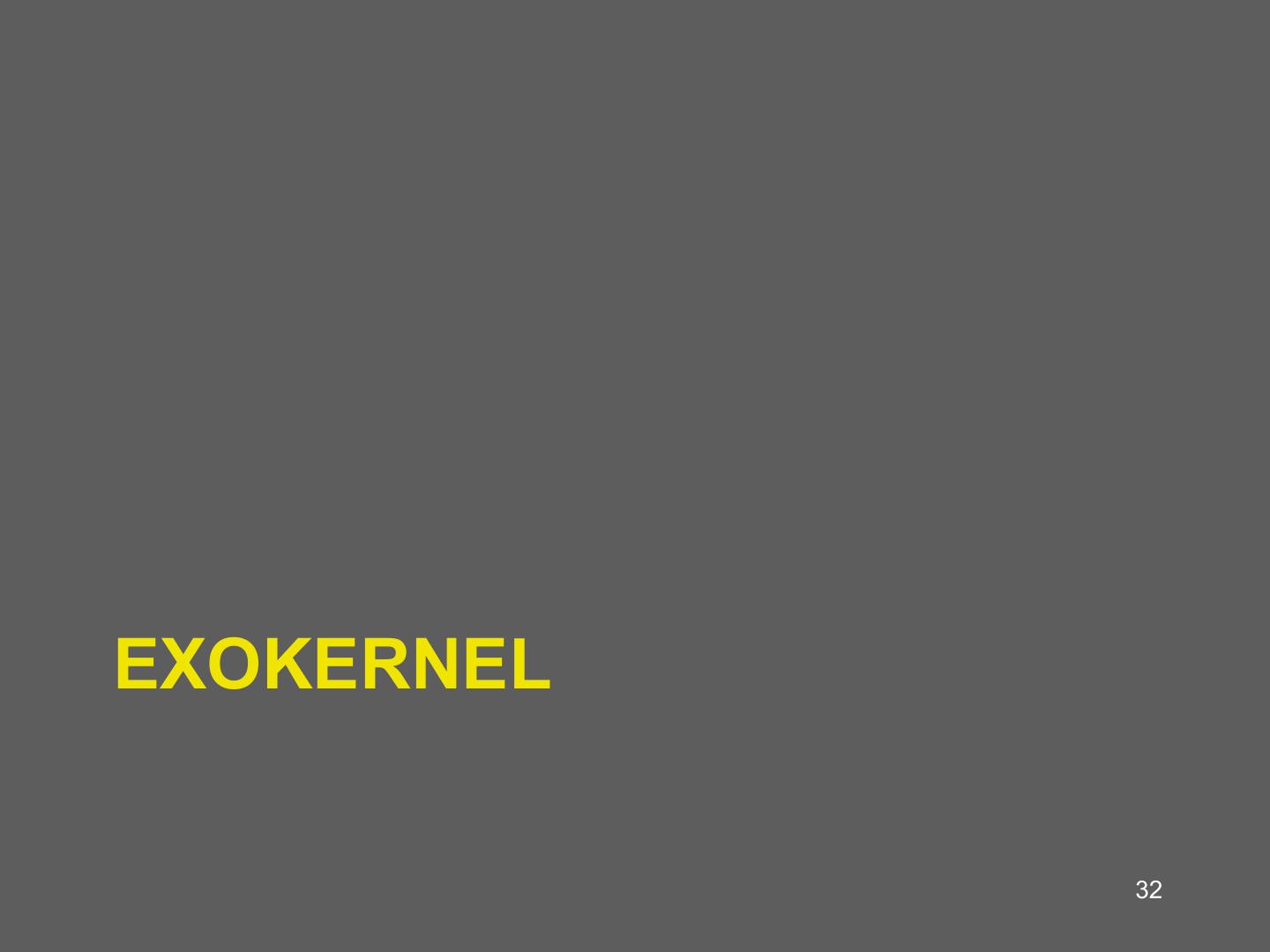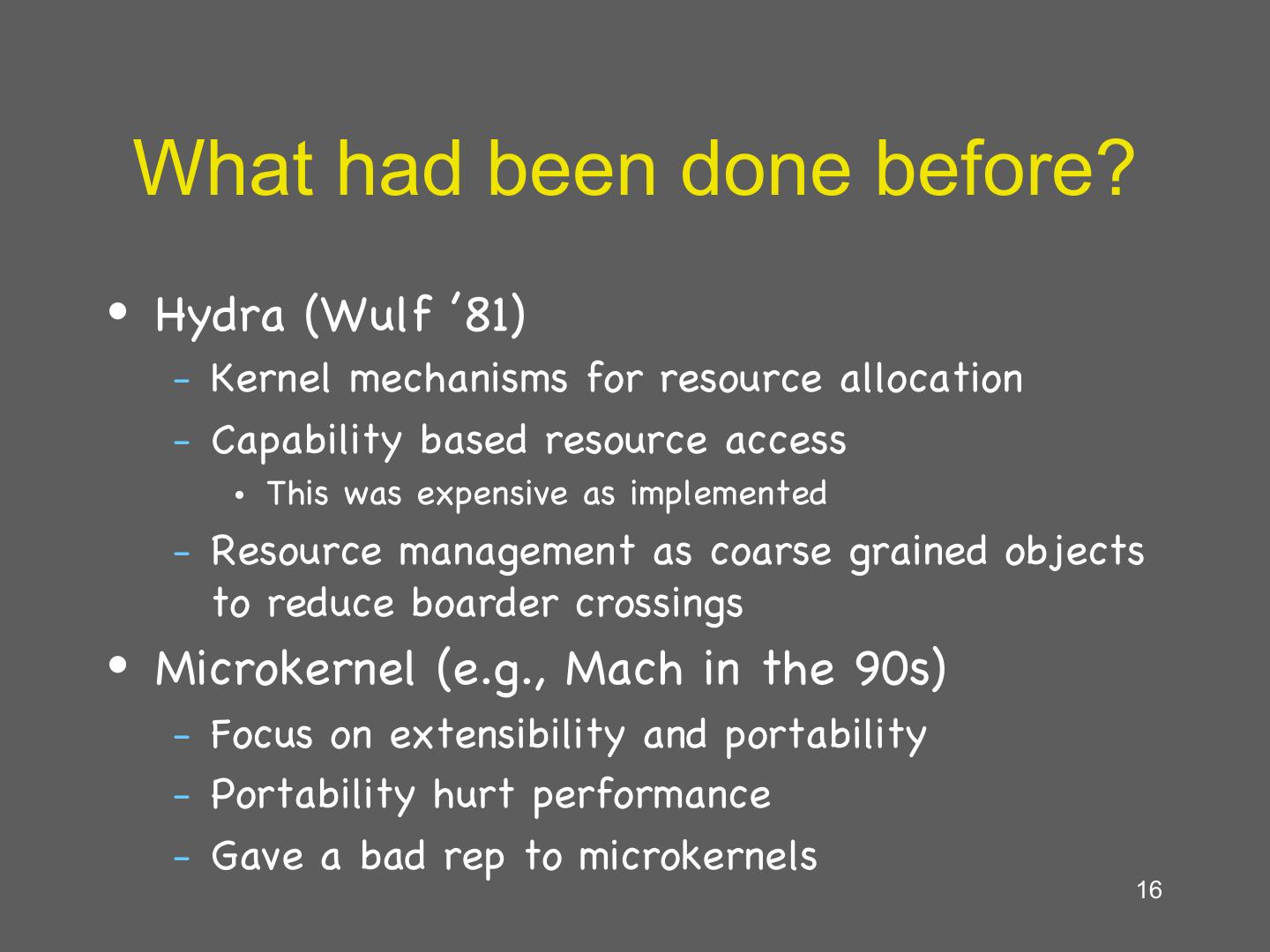 16 . What had been done before? • Hydra (Wulf ’81) – Kernel mechanisms for resource allocation – Capability based resource access • This was expensive as implemented – Resource management as coarse grained objects to reduce boarder crossings • Microkernel (e.g., Mach in the 90s) – Focus on extensibility and portability – Portability hurt performance – Gave a bad rep to microkernels 16