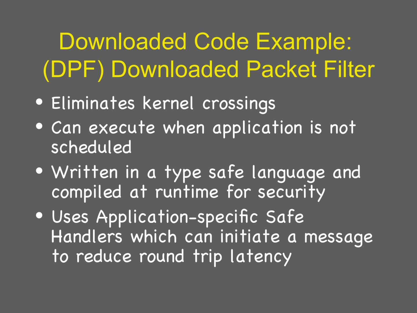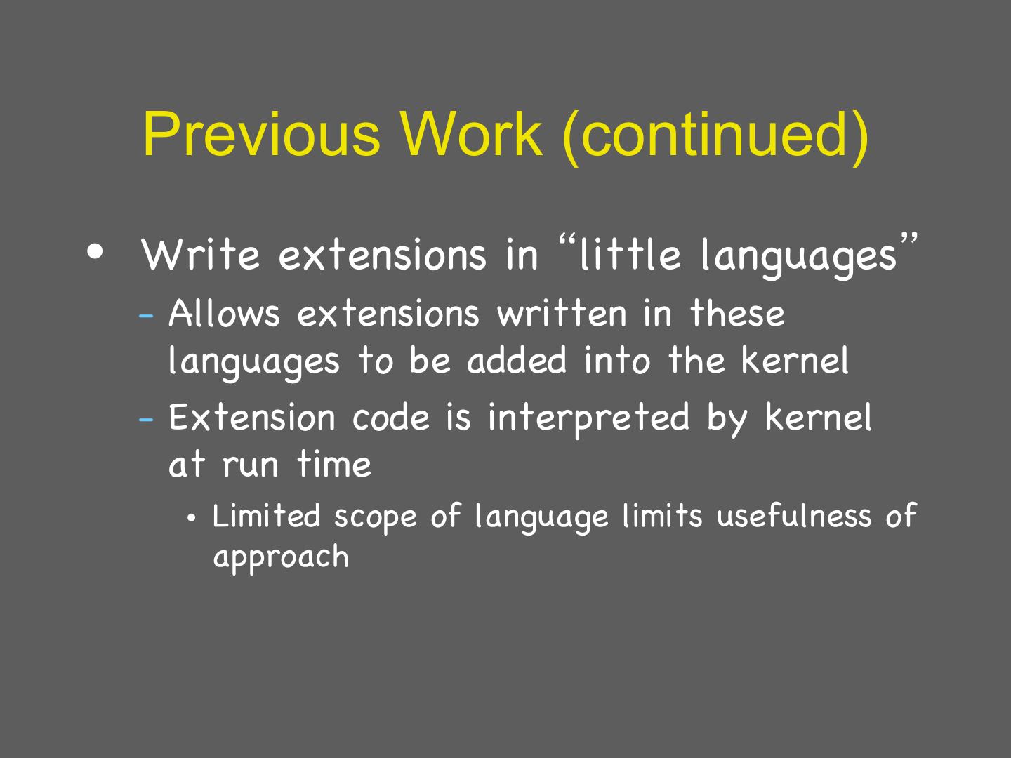 17 . Previous Work (continued) • Write extensions in “little languages” – Allows extensions written in these languages to be added into the kernel – Extension code is interpreted by kernel at run time • Limited scope of language limits usefulness of approach