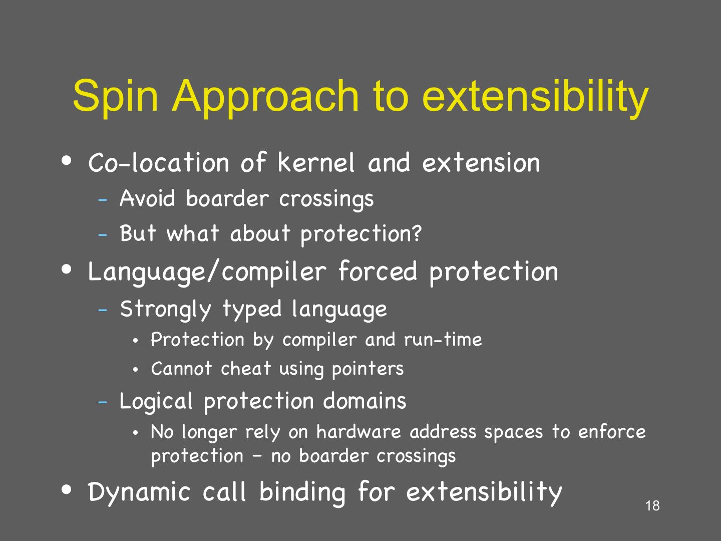 18 .Spin Approach to extensibility • Co-location of kernel and extension – Avoid boarder crossings – But what about protection? • Language/compiler forced protection – Strongly typed language • Protection by compiler and run-time • Cannot cheat using pointers – Logical protection domains • No longer rely on hardware address spaces to enforce protection – no boarder crossings • Dynamic call binding for extensibility 18