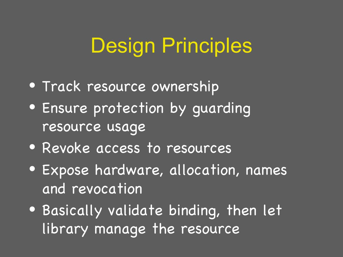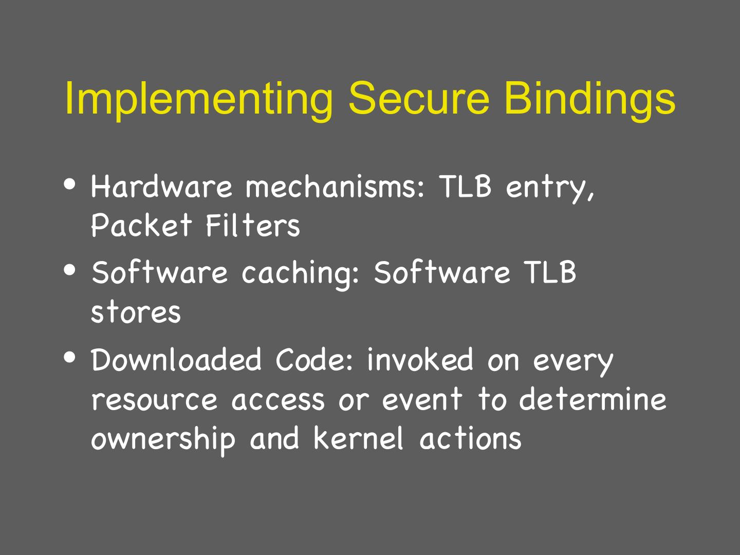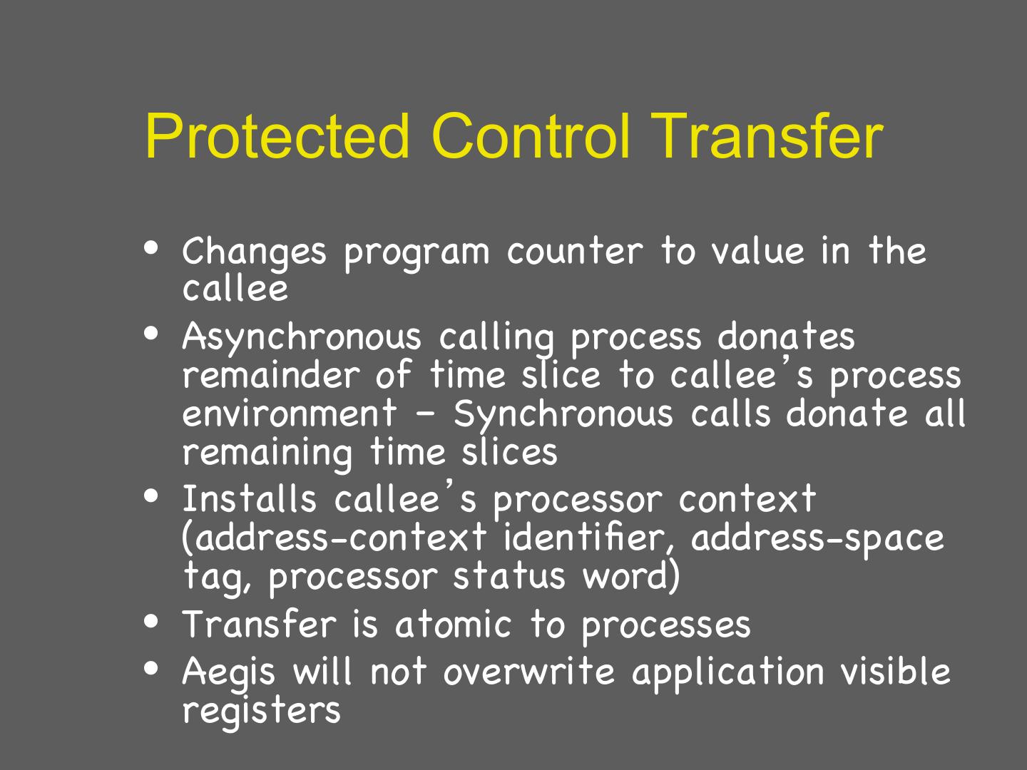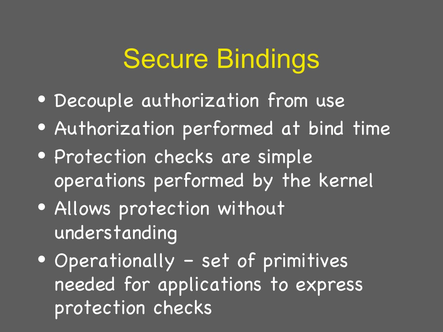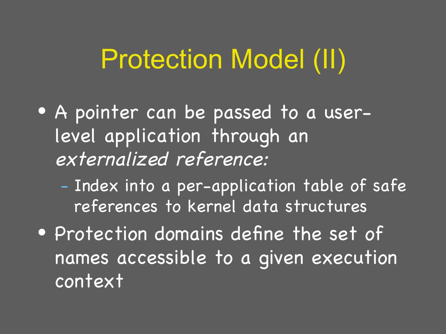 23 . Protection Model (II) • A pointer can be passed to a user- level application through an externalized reference: – Indexinto a per-application table of safe references to kernel data structures • Protection domains define the set of names accessible to a given execution context