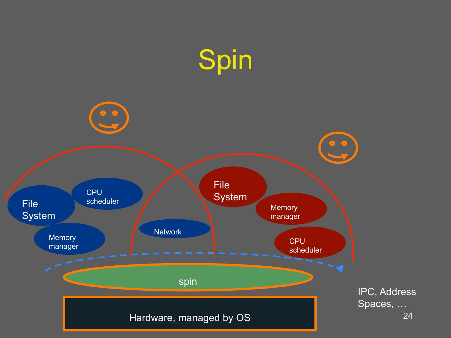 24 . Spin File CPU scheduler System File Memory System manager Network Memory CPU manager scheduler spin IPC, Address Spaces, … Hardware, managed by OS 24