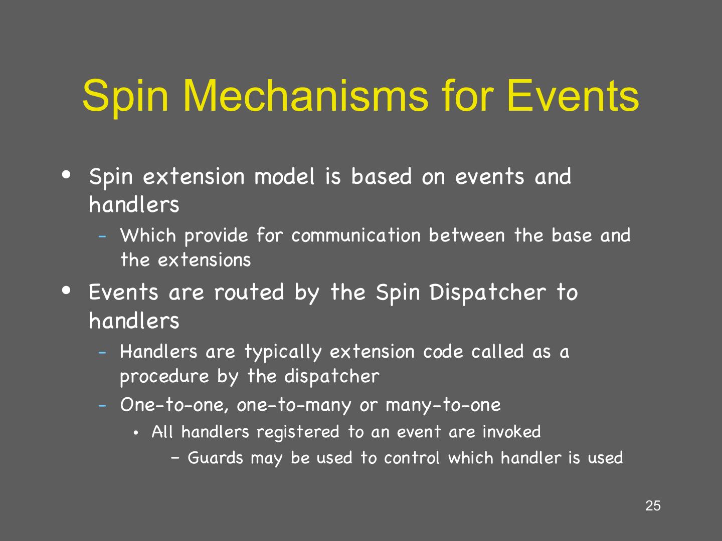 25 . Spin Mechanisms for Events • Spin extension model is based on events and handlers – Which provide for communication between the base and the extensions • Events are routed by the Spin Dispatcher to handlers – Handlers are typically extension code called as a procedure by the dispatcher – One-to-one, one-to-many or many-to-one • All handlers registered to an event are invoked – Guards may be used to control which handler is used 25