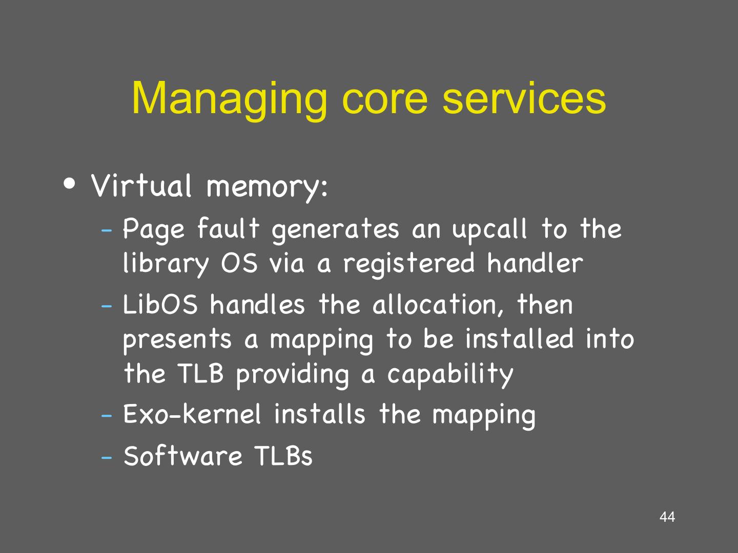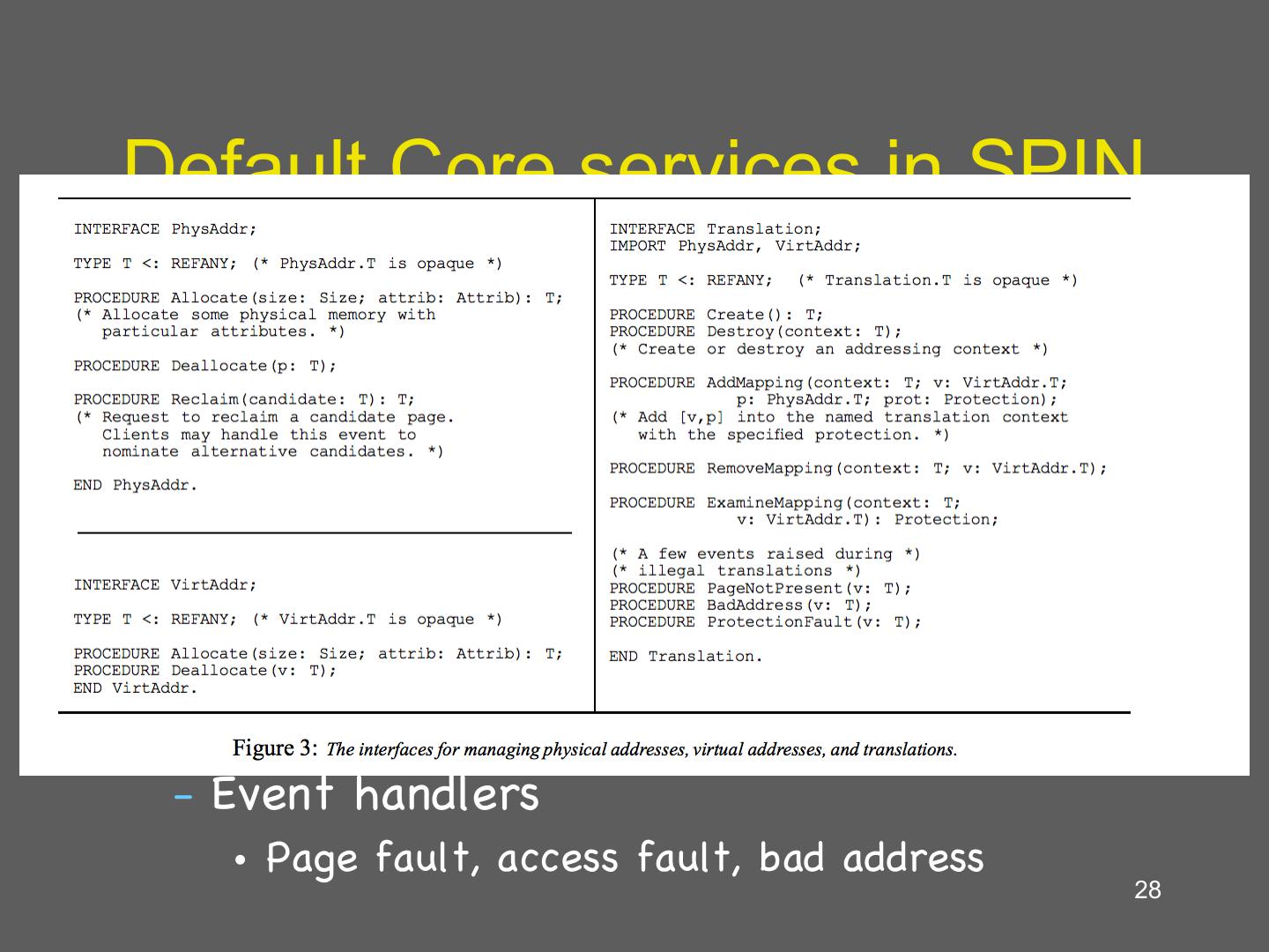 28 .Default Core services in SPIN • Memory management (of memory allocated to the extension) – Physical address • Allocate, deallocate, reclaim – Virtual address • Allocate, deallocate – Translation • Create/destory AS, add/remove mapping – Event handlers • Page fault, access fault, bad address 28