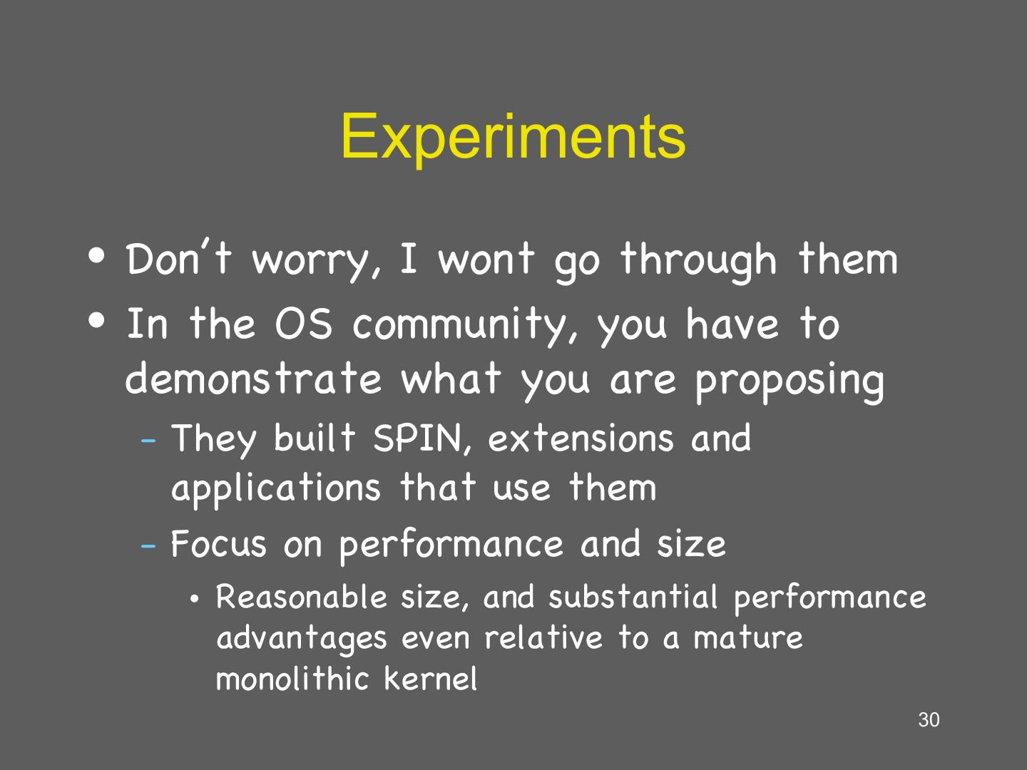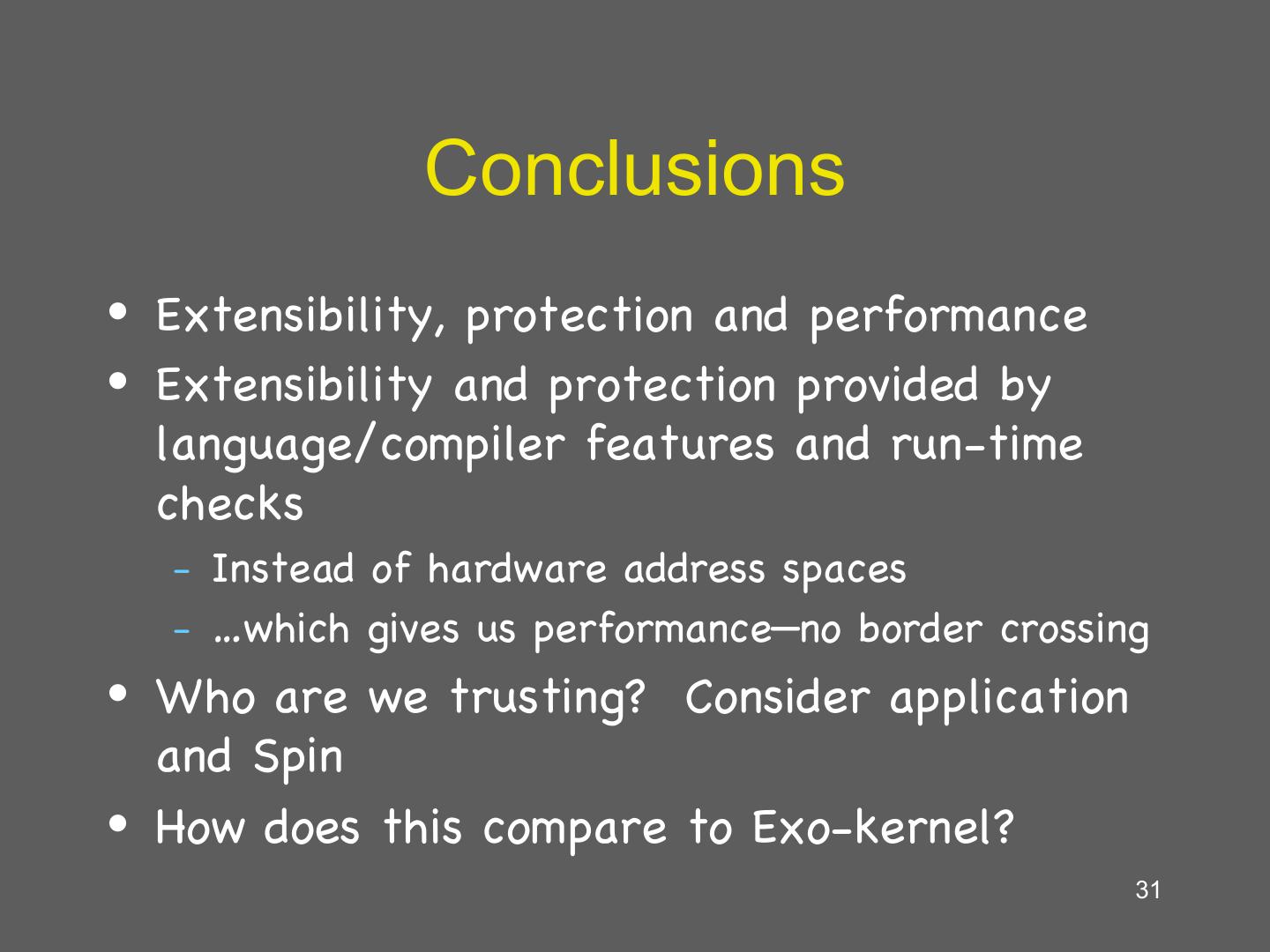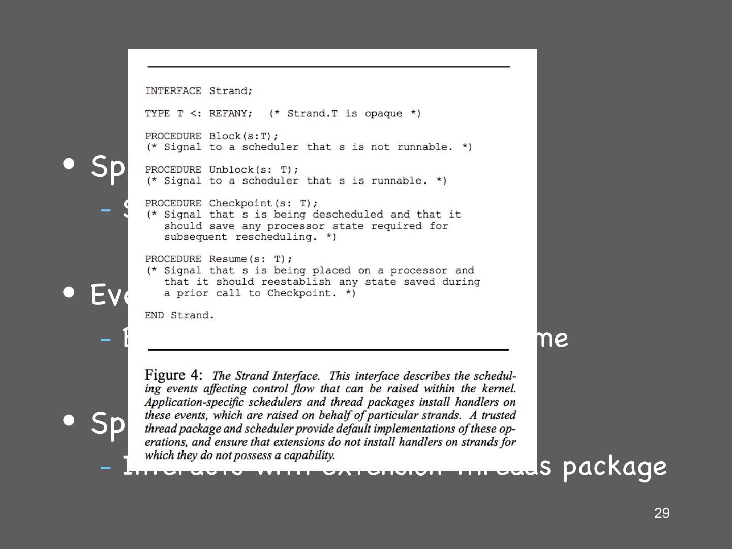 29 . CPU Scheduling • Spin abstraction: strand – Semantics defined by extension • Event handlers – Block, unblock, checkpoint, resume • Spin global scheduler – Interacts with extension threads package 29