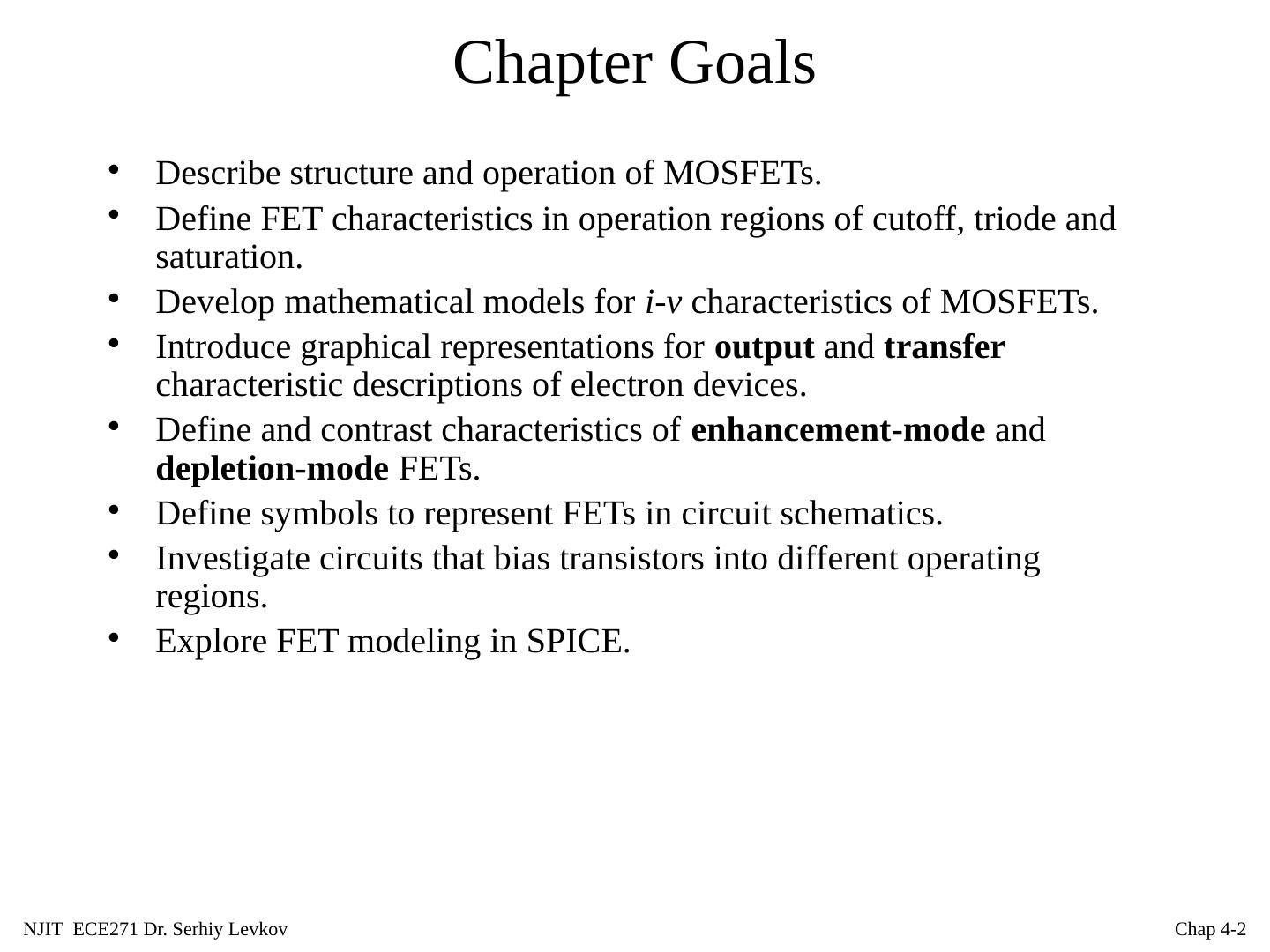 2 .NJIT ECE271 Dr. Serhiy Levkov Chap 4- 2 Chapter Goals Describe structure and operation of MOSFETs. Define FET characteristics in operation regions of cutoff, triode and saturation. Develop mathematical models for i -v characteristics of MOSFETs. Introduce graphical representations for output and transfer characteristic descriptions of electron devices. Define and contrast characteristics of enhancement-mode and depletion-mode FETs. Define symbols to represent FETs in circuit schematics. Investigate circuits that bias transistors into different operating regions. Explore FET modeling in SPICE.