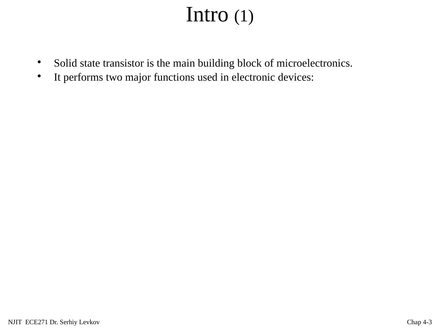 3 .NJIT ECE271 Dr. Serhiy Levkov Chap 4- 3 Intro (1) Solid state transistor is the main building block of microelectronics. It performs two major functions used in electronic devices: