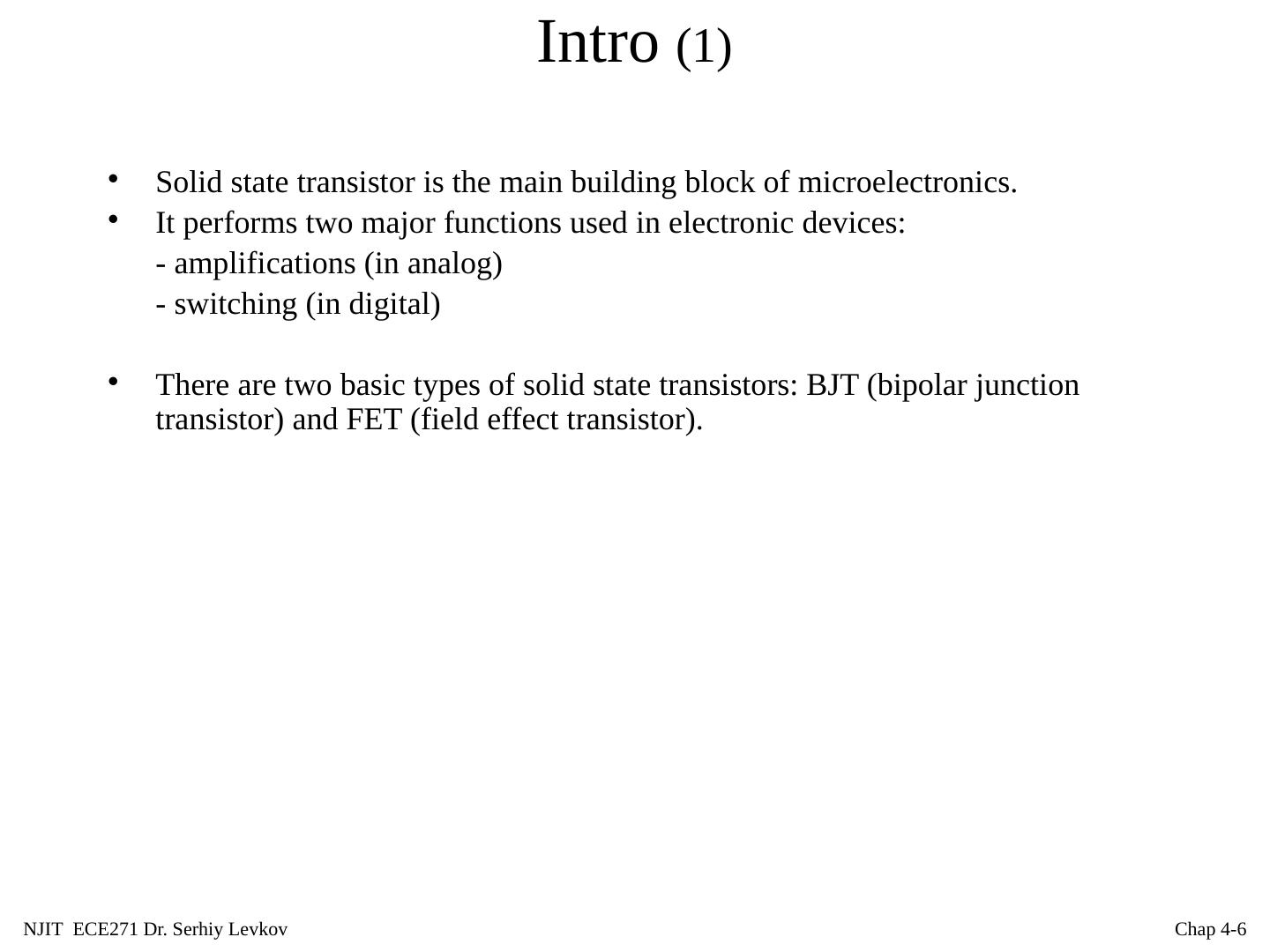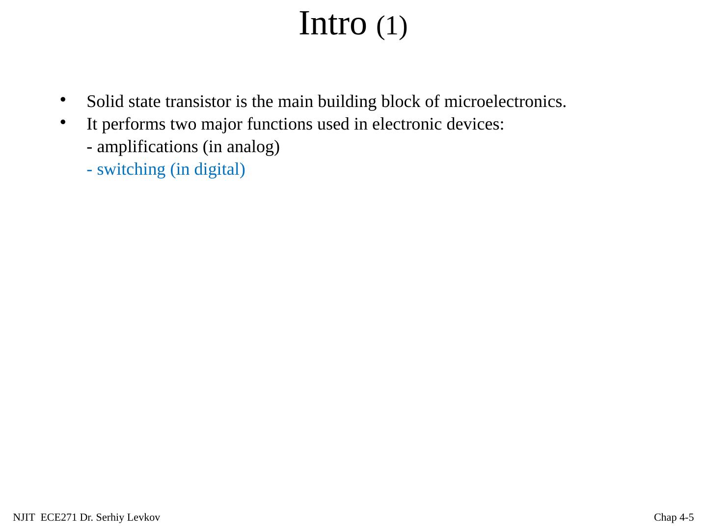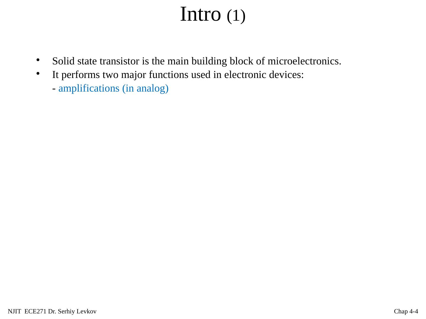4 .NJIT ECE271 Dr. Serhiy Levkov Chap 4- 4 Intro (1) Solid state transistor is the main building block of microelectronics. It performs two major functions used in electronic devices: - amplifications (in analog)