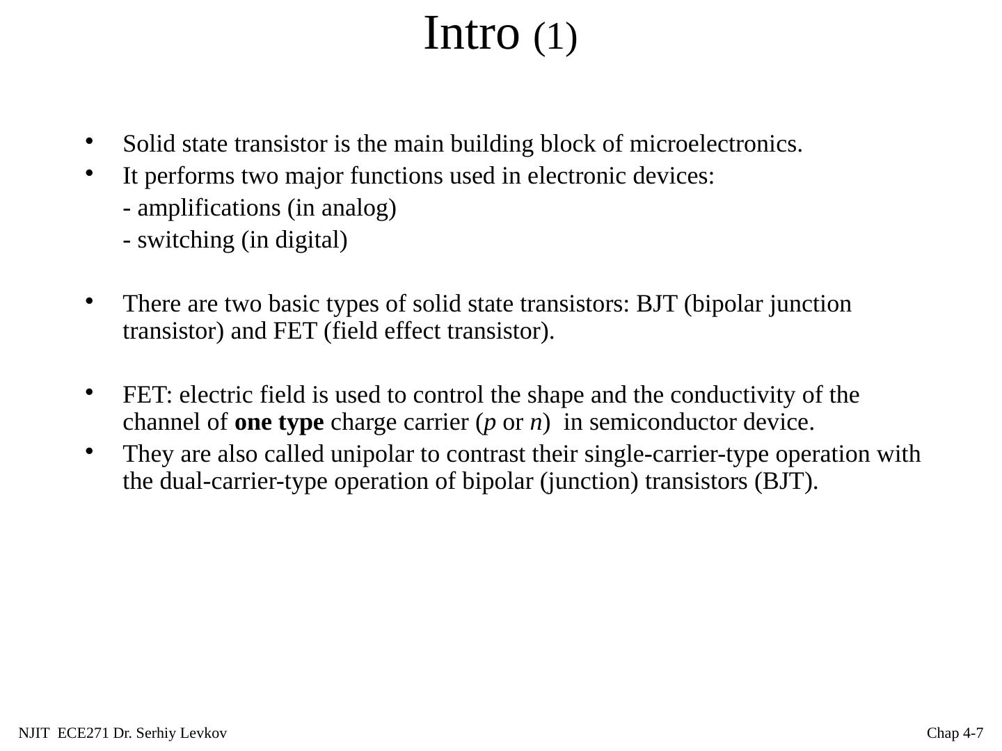 7 .NJIT ECE271 Dr. Serhiy Levkov Chap 4- 7 Intro (1) Solid state transistor is the main building block of microelectronics. It performs two major functions used in electronic devices: - amplifications (in analog) - switching (in digital) There are two basic types of solid state transistors: BJT (bipolar junction transistor) and FET (field effect transistor). FET: electric field is used to control the shape and the conductivity of the channel of one type charge carrier ( p or n ) in semiconductor device. They are also called unipolar to contrast their single-carrier-type operation with the dual-carrier-type operation of bipolar (junction) transistors (BJT).