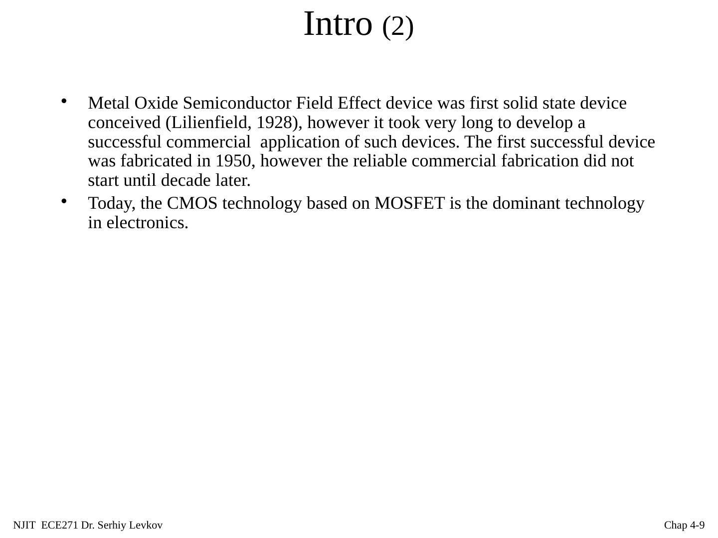 9 .NJIT ECE271 Dr. Serhiy Levkov Chap 4- 9 Intro (2) Metal Oxide Semiconductor Field Effect device was first solid state device conceived ( Lilienfield , 1928), however it took very long to develop a successful commercial application of such devices. The first successful device was fabricated in 1950, however the reliable commercial fabrication did not start until decade later. Today, the CMOS technology based on MOSFET is the dominant technology in electronics.