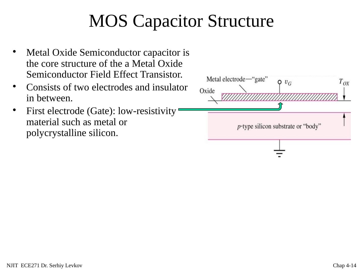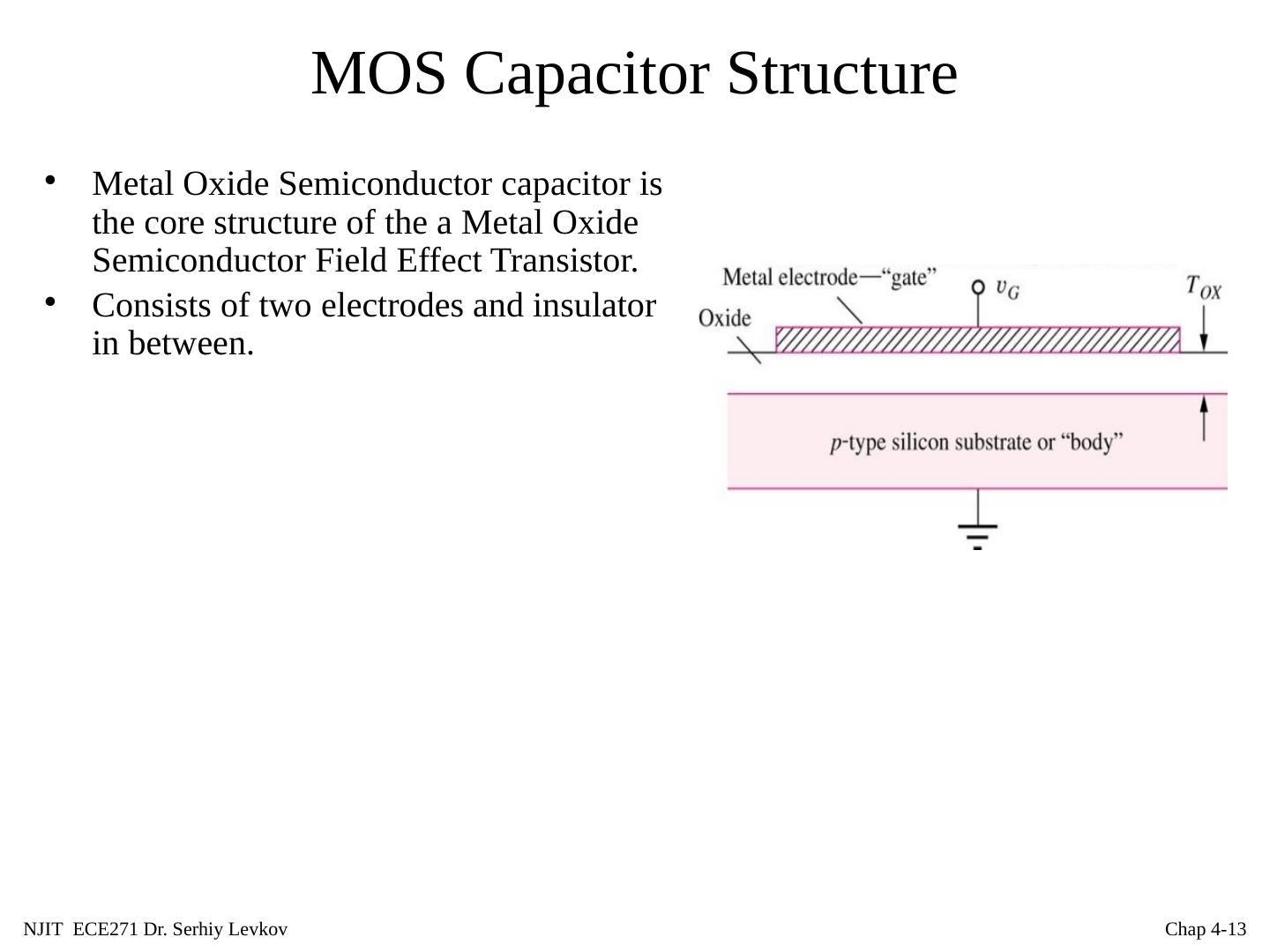 13 .NJIT ECE271 Dr. Serhiy Levkov Chap 4- 13 MOS Capacitor Structure Metal Oxide Semiconductor capacitor is the core structure of the a Metal Oxide Semiconductor Field Effect Transistor. Consists of two electrodes and insulator in between.