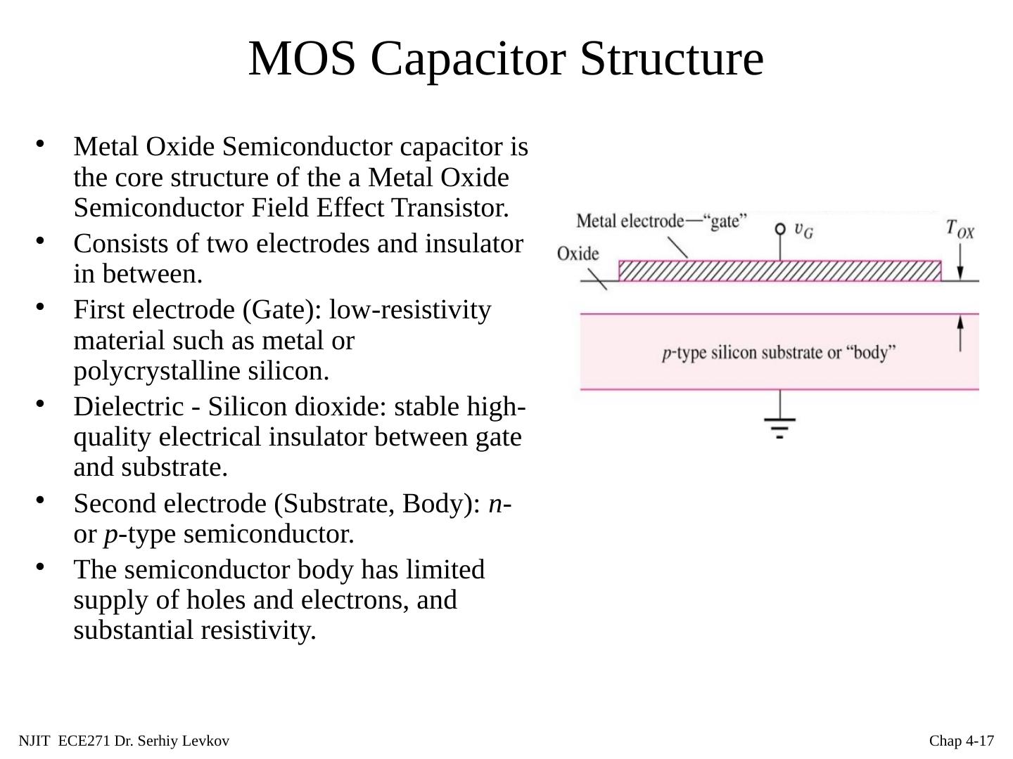 17 .NJIT ECE271 Dr. Serhiy Levkov Chap 4- 17 MOS Capacitor Structure Metal Oxide Semiconductor capacitor is the core structure of the a Metal Oxide Semiconductor Field Effect Transistor. Consists of two electrodes and insulator in between. First electrode (Gate): low-resistivity material such as metal or polycrystalline silicon. Dielectric - Silicon dioxide: stable high-quality electrical insulator between gate and substrate. Second electrode (Substrate, Body): n - or p -type semiconductor. The semiconductor body has limited supply of holes and electrons, and substantial resistivity.