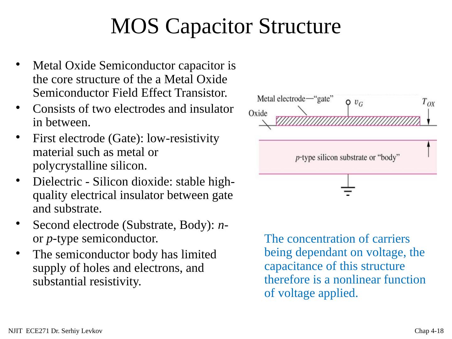 18 .NJIT ECE271 Dr. Serhiy Levkov Chap 4- 18 MOS Capacitor Structure Metal Oxide Semiconductor capacitor is the core structure of the a Metal Oxide Semiconductor Field Effect Transistor. Consists of two electrodes and insulator in between. First electrode (Gate): low-resistivity material such as metal or polycrystalline silicon. Dielectric - Silicon dioxide: stable high-quality electrical insulator between gate and substrate. Second electrode (Substrate, Body): n - or p -type semiconductor. The semiconductor body has limited supply of holes and electrons, and substantial resistivity. The concentration of carriers being dependant on voltage, the capacitance of this structure therefore is a nonlinear function of voltage applied.