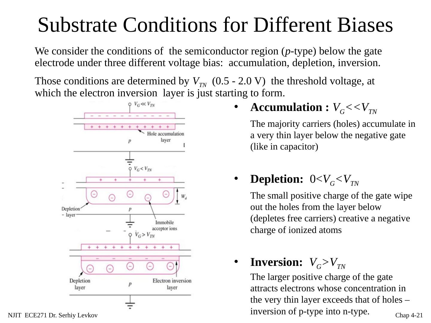 19 .NJIT ECE271 Dr. Serhiy Levkov Chap 4- 19 Substrate Conditions for Different Biases Accumulation : V G <<V TN The majority carriers (holes) accumulate in a very thin layer below the negative gate (like in capacitor) We consider the conditions of the semiconductor region ( p -type) below the gate electrode under three different voltage bias: accumulation, depletion, inversion. Those conditions are determined by V TN (0.5 - 2.0 V) the threshold voltage, at which the electron inversion layer is just starting to form.