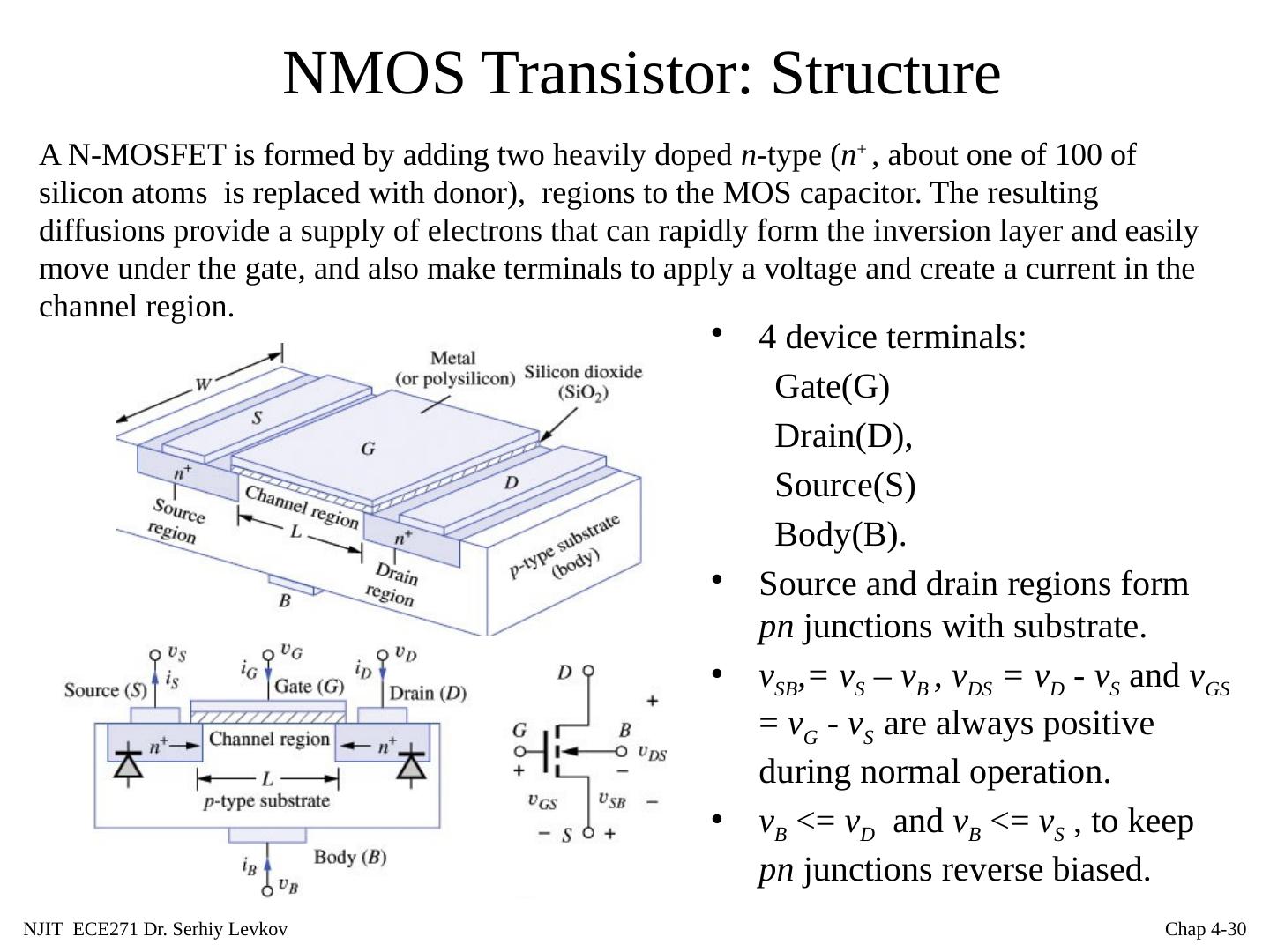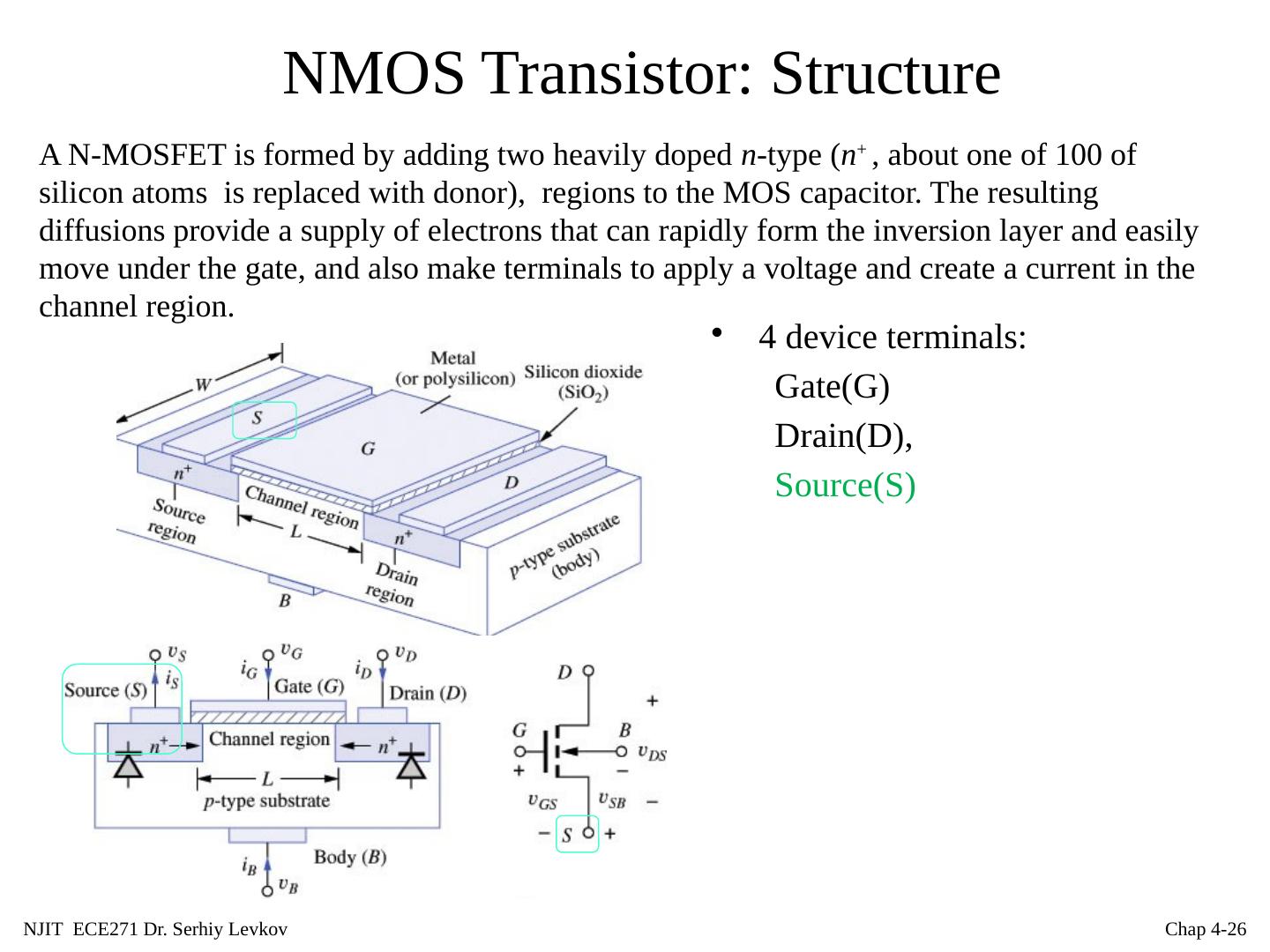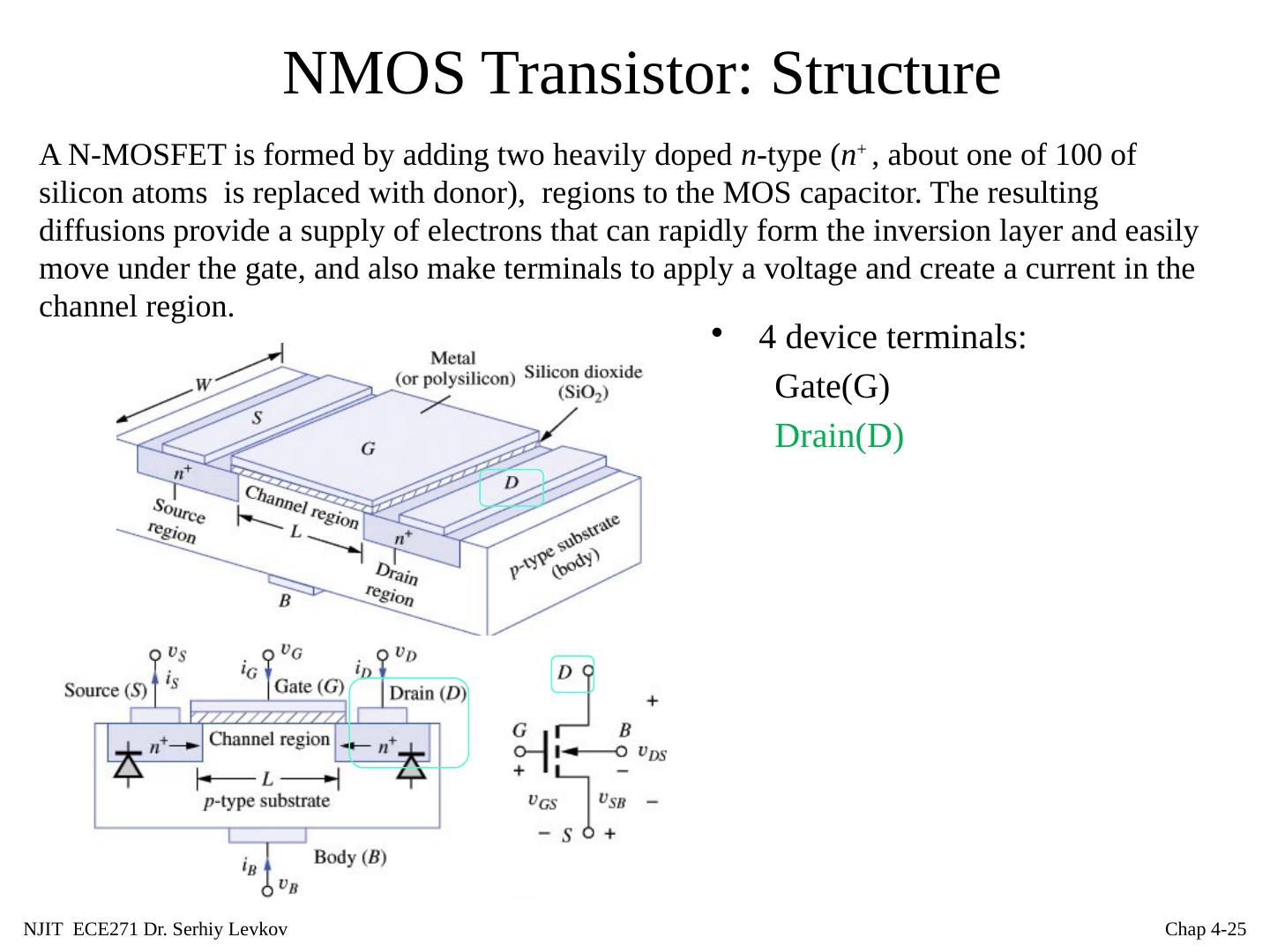 26 .NJIT ECE271 Dr. Serhiy Levkov Chap 4- 26 NMOS Transistor: Structure 4 device terminals: Gate(G) Drain(D), Source(S) A N-MOSFET is formed by adding two heavily doped n -type ( n + , about one of 100 of silicon atoms is replaced with donor), regions to the MOS capacitor. The resulting diffusions provide a supply of electrons that can rapidly form the inversion layer and easily move under the gate, and also make terminals to apply a voltage and create a current in the channel region.