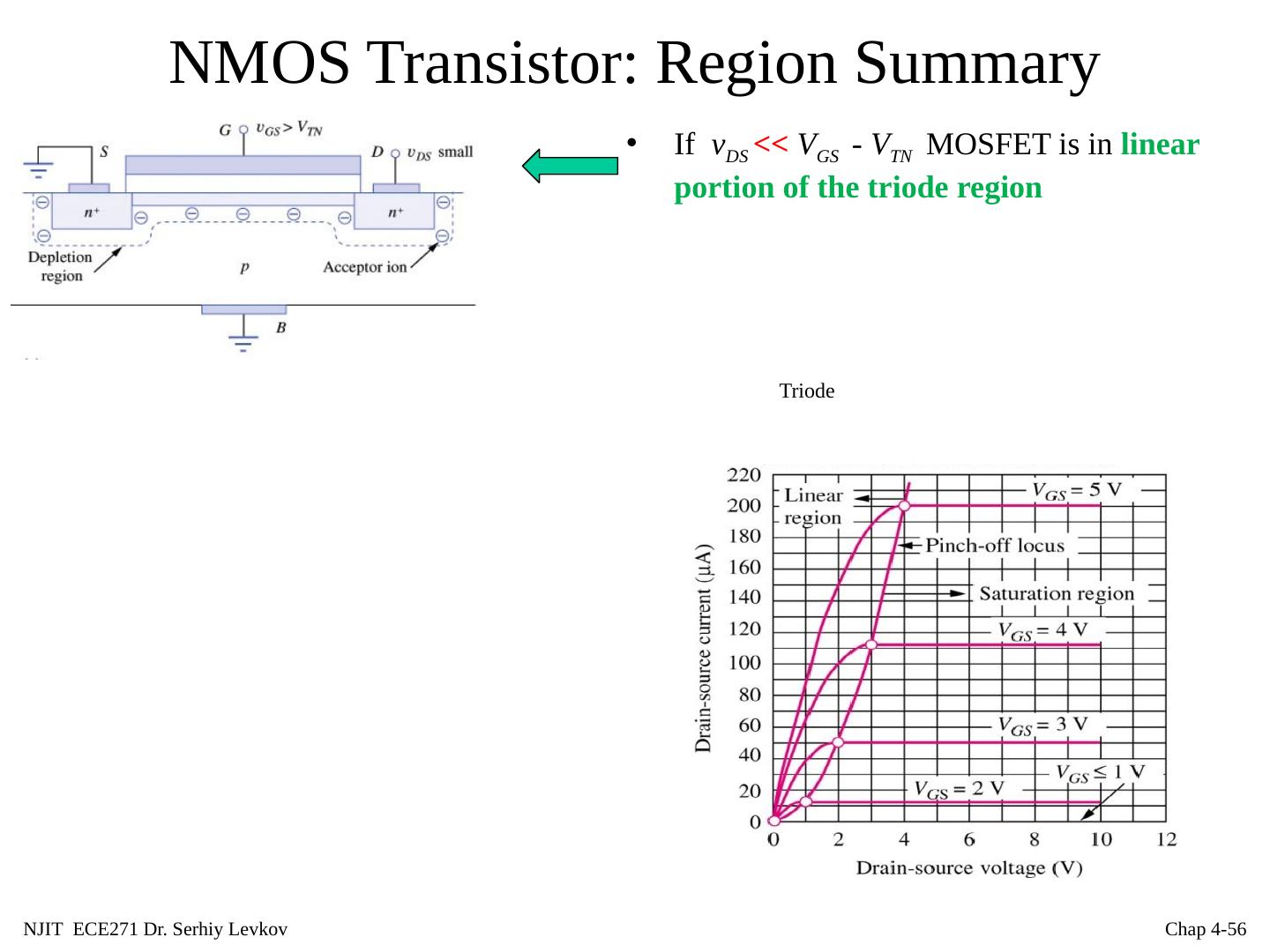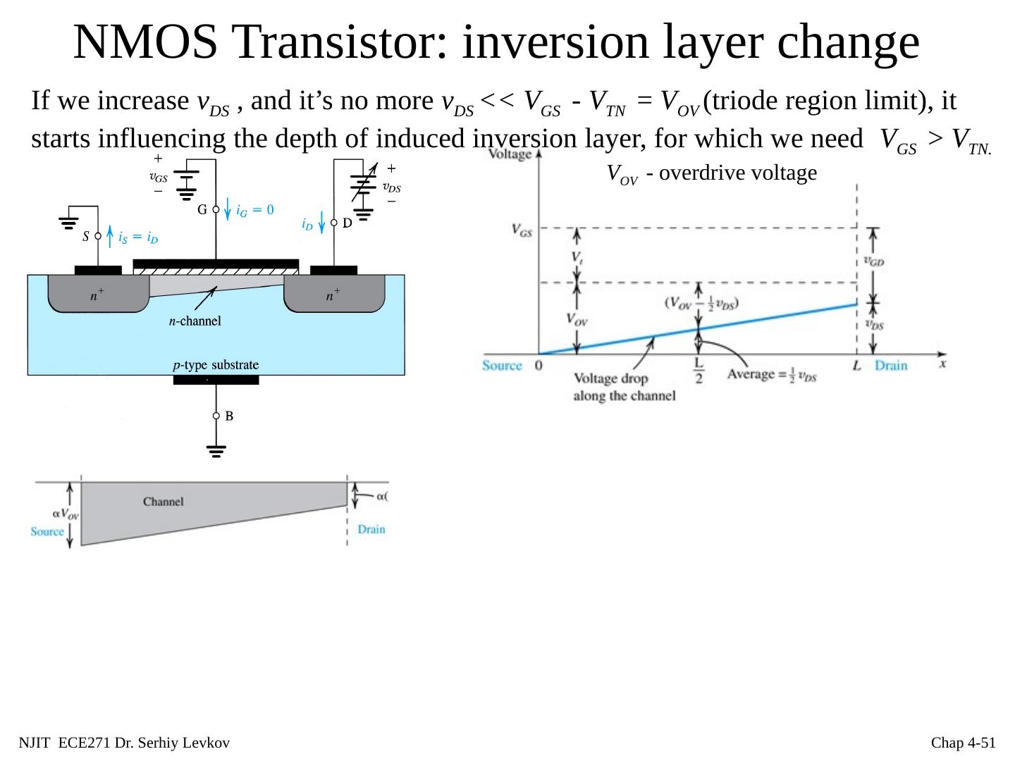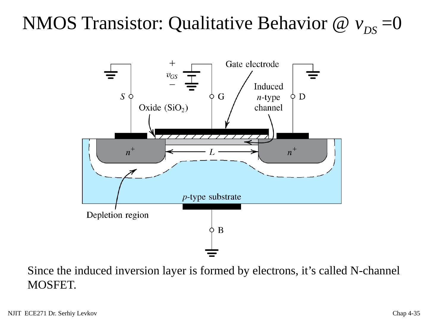 26 .NJIT ECE271 Dr. Serhiy Levkov Chap 4- 26 NMOS Transistor: Structure 4 device terminals: Gate(G) Drain(D), Source(S) A N-MOSFET is formed by adding two heavily doped n -type ( n + , about one of 100 of silicon atoms is replaced with donor), regions to the MOS capacitor. The resulting diffusions provide a supply of electrons that can rapidly form the inversion layer and easily move under the gate, and also make terminals to apply a voltage and create a current in the channel region.