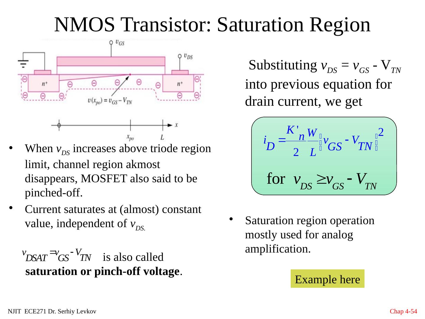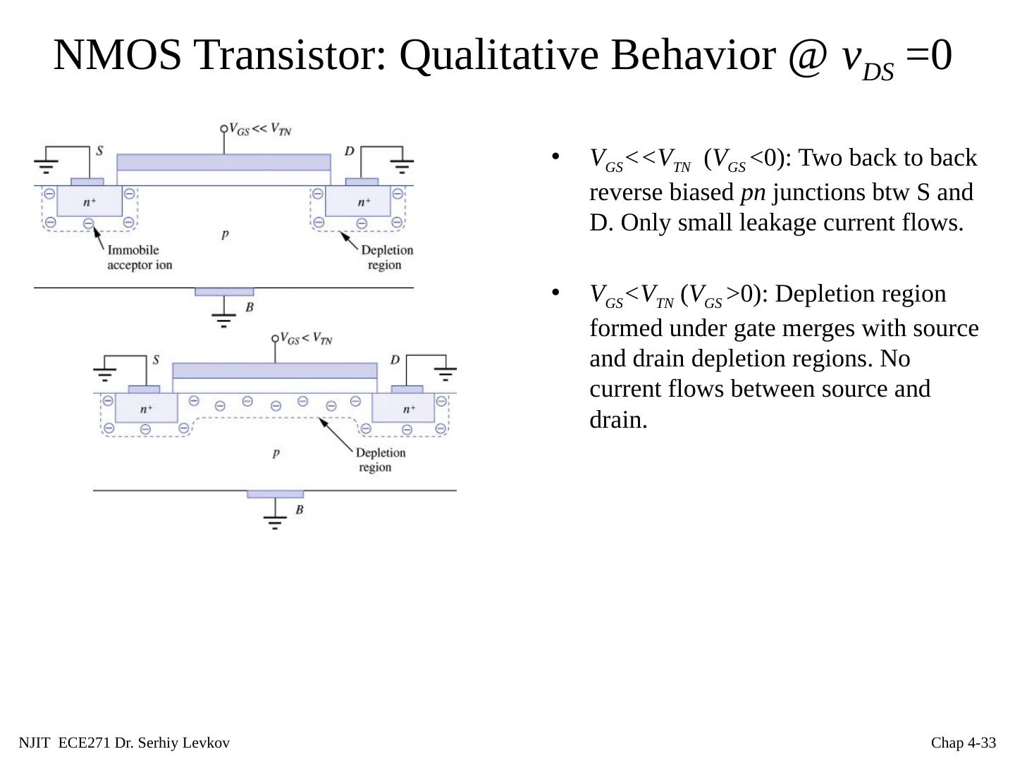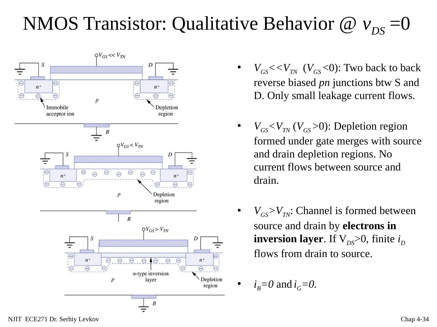 29 .NJIT ECE271 Dr. Serhiy Levkov Chap 4- 29 NMOS Transistor: Structure 4 device terminals: Gate(G) Drain(D), Source(S) Body(B). Source and drain regions form pn junctions with substrate. v SB ,= v S – v B , v DS = v D - v S and v GS = v G - v S are typically nonnegative during normal operation. A N-MOSFET is formed by adding two heavily doped n -type ( n + , about one of 100 of silicon atoms is replaced with donor), regions to the MOS capacitor. The resulting diffusions provide a supply of electrons that can rapidly form the inversion layer and easily move under the gate, and also make terminals to apply a voltage and create a current in the channel region.