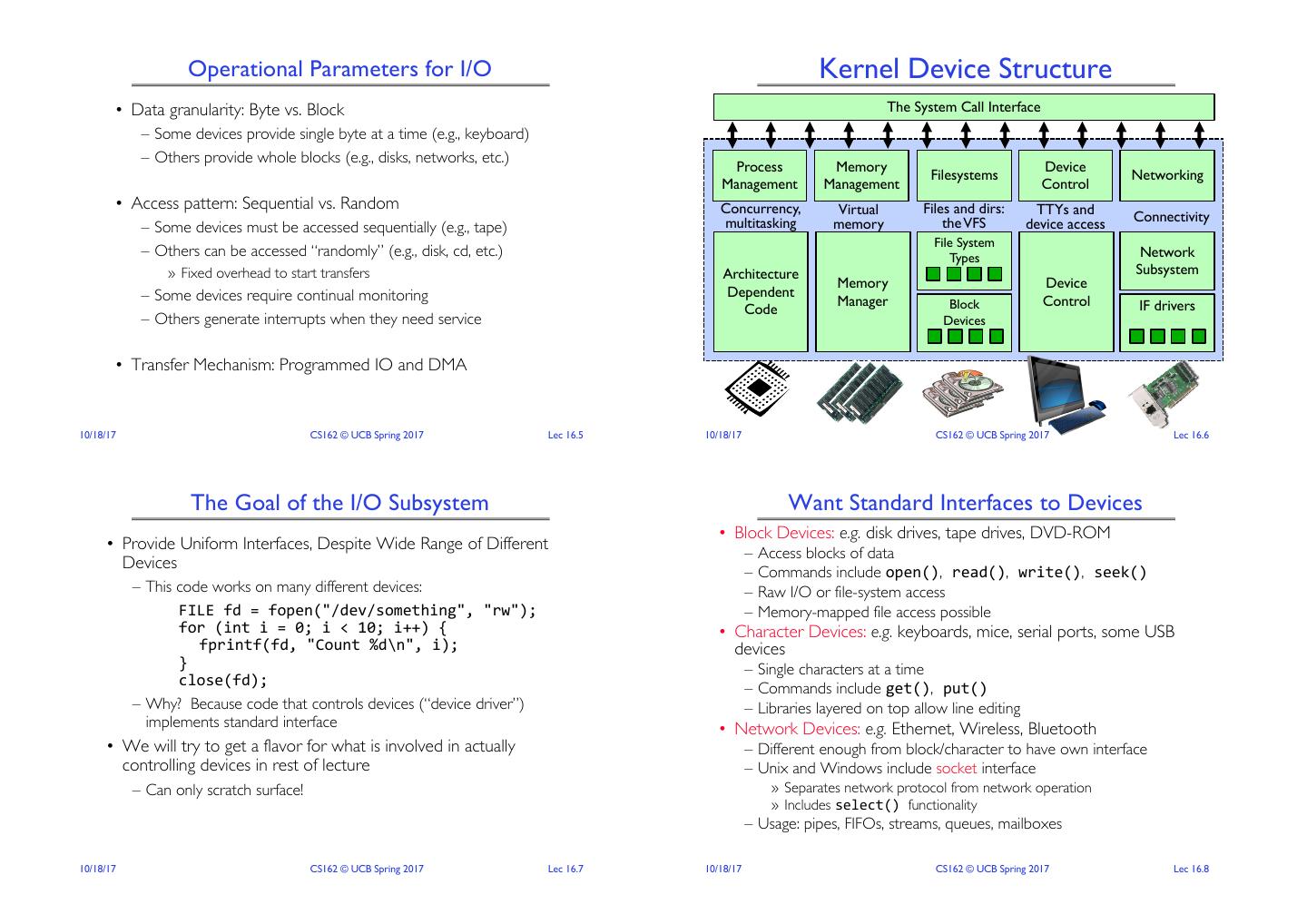 2 . Operational Parameters for I/O Kernel Device Structure • Data granularity: Byte vs. Block The System Call Interface – Some devices provide single byte at a time (e.g., keyboard) – Others provide whole blocks (e.g., disks, networks, etc.) Process Memory Device Filesystems Networking Management Management Control • Access pattern: Sequential vs. Random Concurrency, Virtual Files and dirs: TTYs and multitasking the VFS Connectivity – Some devices must be accessed sequentially (e.g., tape) memory device access File System – Others can be accessed “randomly” (e.g., disk, cd, etc.) Types Network » Fixed overhead to start transfers Architecture Subsystem Memory Device – Some devices require continual monitoring Dependent Manager Block Control IF drivers Code – Others generate interrupts when they need service Devices • Transfer Mechanism: Programmed IO and DMA 10/18/17 CS162 © UCB Spring 2017 Lec 16.5 10/18/17 CS162 © UCB Spring 2017 Lec 16.6 The Goal of the I/O Subsystem Want Standard Interfaces to Devices • Block Devices: e.g. disk drives, tape drives, DVD-ROM • Provide Uniform Interfaces, Despite Wide Range of Different – Access blocks of data Devices – Commands include open(), read(), write(), seek() – This code works on many different devices: – Raw I/O or file-system access FILE fd = fopen("/dev/something", "rw"); – Memory-mapped file access possible for (int i = 0; i < 10; i++) { • Character Devices: e.g. keyboards, mice, serial ports, some USB fprintf(fd, "Count %d\n", i); devices } – Single characters at a time close(fd); – Commands include get(), put() – Why? Because code that controls devices (“device driver”) – Libraries layered on top allow line editing implements standard interface • Network Devices: e.g. Ethernet, Wireless, Bluetooth • We will try to get a flavor for what is involved in actually – Different enough from block/character to have own interface controlling devices in rest of lecture – Unix and Windows include socket interface – Can only scratch surface! » Separates network protocol from network operation » Includes select() functionality – Usage: pipes, FIFOs, streams, queues, mailboxes 10/18/17 CS162 © UCB Spring 2017 Lec 16.7 10/18/17 CS162 © UCB Spring 2017 Lec 16.8