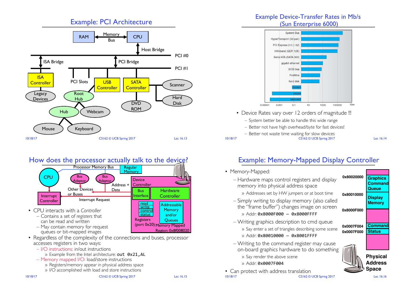4 . Example Device-Transfer Rates in Mb/s Example: PCI Architecture (Sun Enterprise 6000) Memory RAM CPU Bus Host Bridge PCI #0 ISA Bridge PCI Bridge PCI #1 ISA Controller PCI Slots USB SATA Scanner Controller Controller Legacy Root Devices Hub Hard DVD Disk 10m ROM Hub Webcam • Device Rates vary over 12 orders of magnitude !!! – System better be able to handle this wide range Mouse Keyboard – Better not have high overhead/byte for fast devices! – Better not waste time waiting for slow devices 10/18/17 CS162 © UCB Spring 2017 Lec 16.13 10/18/17 CS162 © UCB Spring 2017 Lec 16.14 How does the processor actually talk to the device? Example: Memory-Mapped Display Controller Processor Memory Bus Regular Memory • Memory-Mapped: CPU Bus Bus 0x80020000 Adaptor Adaptor Device – Hardware maps control registers and display Graphics Address + Controller Command memory into physical address space Queue Other Devices Data Bus Hardware or Buses » Addresses set by HW jumpers or at boot time 0x80010000 Interrupt Interface Controller Display Controller Interrupt Request – Simply writing to display memory (also called read Addressable Memory write the “frame buffer”) changes image on screen • CPU interacts with a Controller control Memory 0x8000F000 status and/or » Addr: 0x8000F000 — 0x8000FFFF – Contains a set of registers that can be read and written Registers Queues (port 0x20) Memory Mapped – Writing graphics description to cmd queue – May contain memory for request 0x0007F004 Command Region: 0x8f008020 » Say enter a set of triangles describing some scene queues or bit-mapped images 0x0007F000 Status » Addr: 0x80010000 — 0x8001FFFF • Regardless of the complexity of the connections and buses, processor accesses registers in two ways: – Writing to the command register may cause – I/O instructions: in/out instructions on-board graphics hardware to do something » Example from the Intel architecture: out 0x21,AL » Say render the above scene Physical – Memory mapped I/O: load/store instructions » Registers/memory appear in physical address space » Addr: 0x0007F004 Address » I/O accomplished with load and store instructions • Can protect with address translation Space 10/18/17 CS162 © UCB Spring 2017 Lec 16.15 10/18/17 CS162 © UCB Spring 2017 Lec 16.16