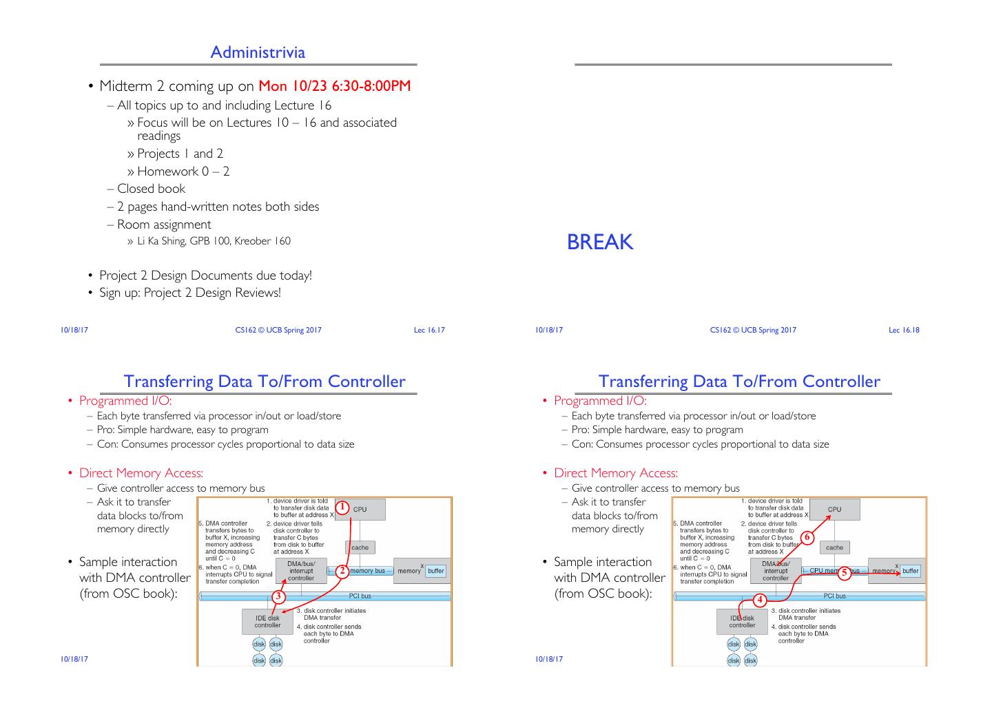 5 . Administrivia • Midterm 2 coming up on Mon 10/23 6:30-8:00PM – All topics up to and including Lecture 16 » Focus will be on Lectures 10 – 16 and associated readings » Projects 1 and 2 » Homework 0 – 2 – Closed book – 2 pages hand-written notes both sides – Room assignment » Li Ka Shing, GPB 100, Kreober 160 BREAK • Project 2 Design Documents due today! • Sign up: Project 2 Design Reviews! 10/18/17 CS162 © UCB Spring 2017 Lec 16.17 10/18/17 CS162 © UCB Spring 2017 Lec 16.18 Transferring Data To/From Controller Transferring Data To/From Controller • Programmed I/O: • Programmed I/O: – Each byte transferred via processor in/out or load/store – Each byte transferred via processor in/out or load/store – Pro: Simple hardware, easy to program – Pro: Simple hardware, easy to program – Con: Consumes processor cycles proportional to data size – Con: Consumes processor cycles proportional to data size • Direct Memory Access: • Direct Memory Access: – Give controller access to memory bus – Give controller access to memory bus – Ask it to transfer 1 – Ask it to transfer data blocks to/from data blocks to/from memory directly memory directly 6 • Sample interaction • Sample interaction 2 5 with DMA controller with DMA controller (from OSC book): 3 (from OSC book): 4 10/18/17 CS162 © UCB Spring 2017 Lec 16.19 10/18/17 CS162 © UCB Spring 2017 Lec 16.20