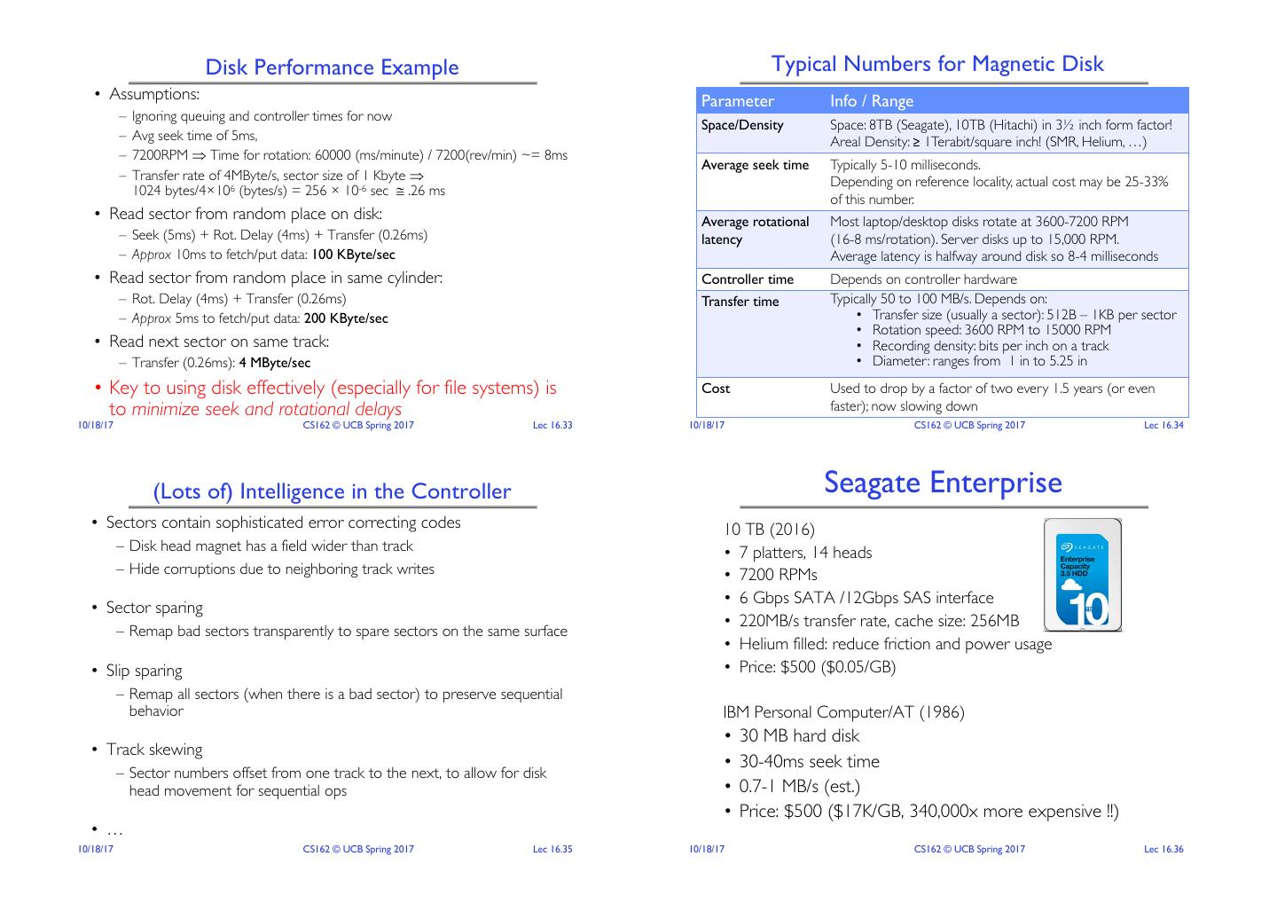 9 . Disk Performance Example Typical Numbers for Magnetic Disk • Assumptions: Parameter Info / Range – Ignoring queuing and controller times for now Space/Density Space: 8TB (Seagate), 10TB (Hitachi) in 3½ inch form factor! – Avg seek time of 5ms, Areal Density: ≥ 1Terabit/square inch! (SMR, Helium, …) – 7200RPM Þ Time for rotation: 60000 (ms/minute) / 7200(rev/min) ~= 8ms Average seek time Typically 5-10 milliseconds. – Transfer rate of 4MByte/s, sector size of 1 Kbyte Þ Depending on reference locality, actual cost may be 25-33% 1024 bytes/4×106 (bytes/s) = 256 × 10-6 sec @ .26 ms of this number. • Read sector from random place on disk: Average rotational Most laptop/desktop disks rotate at 3600-7200 RPM – Seek (5ms) + Rot. Delay (4ms) + Transfer (0.26ms) latency (16-8 ms/rotation). Server disks up to 15,000 RPM. – Approx 10ms to fetch/put data: 100 KByte/sec Average latency is halfway around disk so 8-4 milliseconds • Read sector from random place in same cylinder: Controller time Depends on controller hardware – Rot. Delay (4ms) + Transfer (0.26ms) Transfer time Typically 50 to 100 MB/s. Depends on: – Approx 5ms to fetch/put data: 200 KByte/sec • Transfer size (usually a sector): 512B – 1KB per sector • Rotation speed: 3600 RPM to 15000 RPM • Read next sector on same track: • Recording density: bits per inch on a track – Transfer (0.26ms): 4 MByte/sec • Diameter: ranges from 1 in to 5.25 in • Key to using disk effectively (especially for file systems) is Cost Used to drop by a factor of two every 1.5 years (or even to minimize seek and rotational delays faster); now slowing down 10/18/17 CS162 © UCB Spring 2017 Lec 16.33 10/18/17 CS162 © UCB Spring 2017 Lec 16.34 (Lots of) Intelligence in the Controller Seagate Enterprise • Sectors contain sophisticated error correcting codes 10 TB (2016) – Disk head magnet has a field wider than track • 7 platters, 14 heads – Hide corruptions due to neighboring track writes • 7200 RPMs • 6 Gbps SATA /12Gbps SAS interface • Sector sparing • 220MB/s transfer rate, cache size: 256MB – Remap bad sectors transparently to spare sectors on the same surface • Helium filled: reduce friction and power usage • Slip sparing • Price: $500 ($0.05/GB) – Remap all sectors (when there is a bad sector) to preserve sequential behavior IBM Personal Computer/AT (1986) • 30 MB hard disk • Track skewing • 30-40ms seek time – Sector numbers offset from one track to the next, to allow for disk head movement for sequential ops • 0.7-1 MB/s (est.) • Price: $500 ($17K/GB, 340,000x more expensive !!) • … 10/18/17 CS162 © UCB Spring 2017 Lec 16.35 10/18/17 CS162 © UCB Spring 2017 Lec 16.36