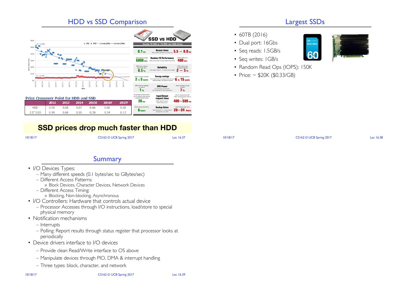 10 . HDD vs SSD Comparison Largest SSDs • 60TB (2016) • Dual port: 16Gbs • Seq reads: 1.5GB/s • Seq writes: 1GB/s • Random Read Ops (IOPS): 150K • Price: ~ $20K ($0.33/GB) SSD prices drop much faster than HDD 10/18/17 CS162 © UCB Spring 2017 Lec 16.37 10/18/17 CS162 © UCB Spring 2017 Lec 16.38 Summary • I/O Devices Types: – Many different speeds (0.1 bytes/sec to GBytes/sec) – Different Access Patterns: » Block Devices, Character Devices, Network Devices – Different Access Timing: » Blocking, Non-blocking, Asynchronous • I/O Controllers: Hardware that controls actual device – Processor Accesses through I/O instructions, load/store to special physical memory • Notification mechanisms – Interrupts – Polling: Report results through status register that processor looks at periodically • Device drivers interface to I/O devices – Provide clean Read/Write interface to OS above – Manipulate devices through PIO, DMA & interrupt handling – Three types: block, character, and network 10/18/17 CS162 © UCB Spring 2017 Lec 16.39