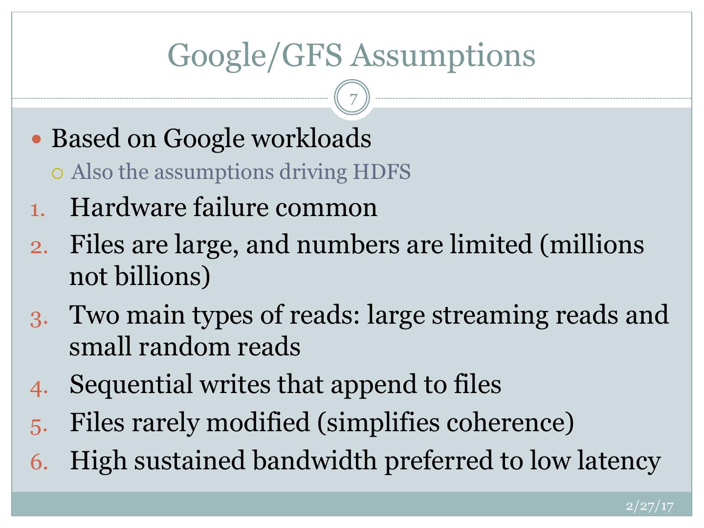 7 . Google/GFS Assumptions 7 Based on Google workloads ¡ Also the assumptions driving HDFS 1. Hardware failure common 2. Files are large, and numbers are limited (millions not billions) 3. Two main types of reads: large streaming reads and small random reads 4. Sequential writes that append to files 5. Files rarely modified (simplifies coherence) 6. High sustained bandwidth preferred to low latency 2/27/17