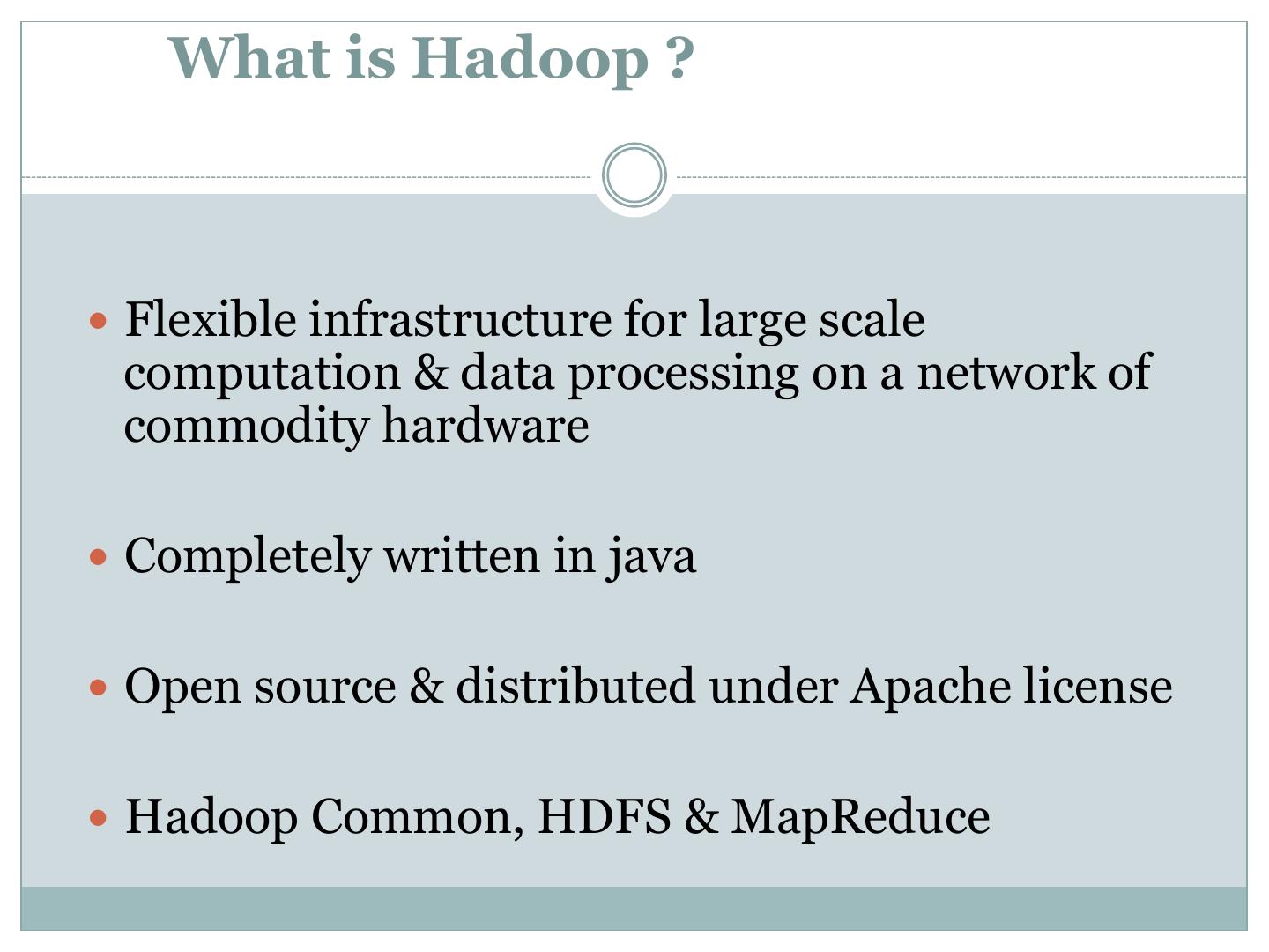 8 . What is Hadoop ? Flexible infrastructure for large scale computation & data processing on a network of commodity hardware Completely written in java Open source & distributed under Apache license Hadoop Common, HDFS & MapReduce