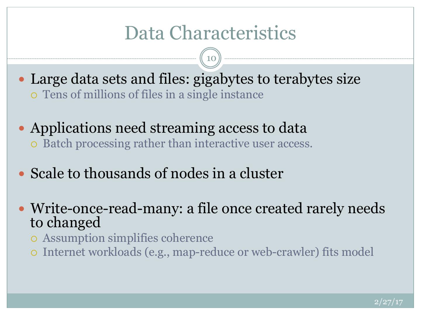 10 . Data Characteristics 10 Large data sets and files: gigabytes to terabytes size ¡ Tens of millions of files in a single instance Applications need streaming access to data ¡ Batch processing rather than interactive user access. Scale to thousands of nodes in a cluster Write-once-read-many: a file once created rarely needs to changed ¡ Assumption simplifies coherence ¡ Internet workloads (e.g., map-reduce or web-crawler) fits model 2/27/17