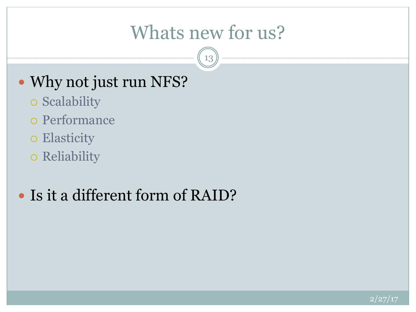 13 . Whats new for us? 13 Why not just run NFS? ¡ Scalability ¡ Performance ¡ Elasticity ¡ Reliability Is it a different form of RAID? 2/27/17