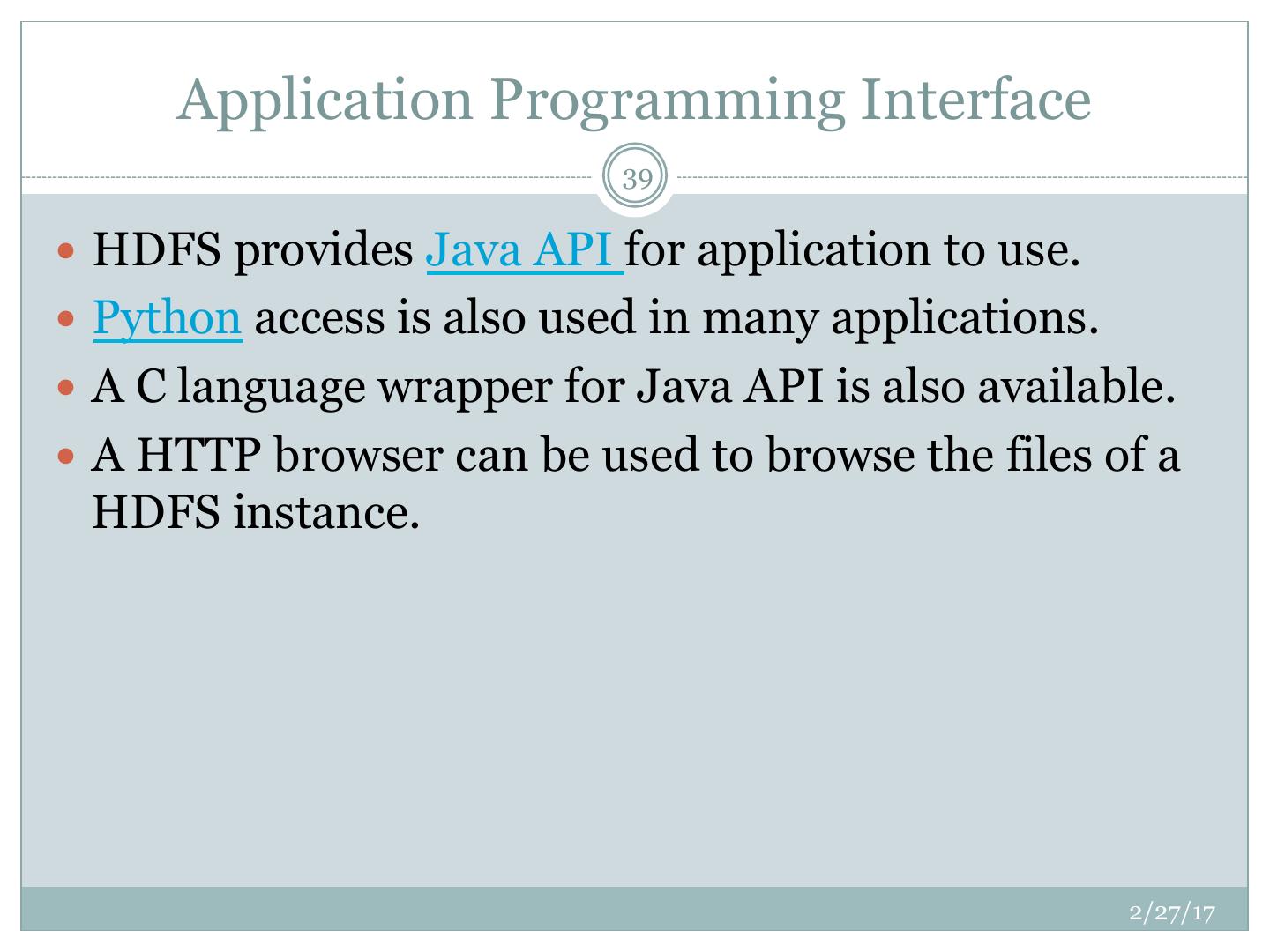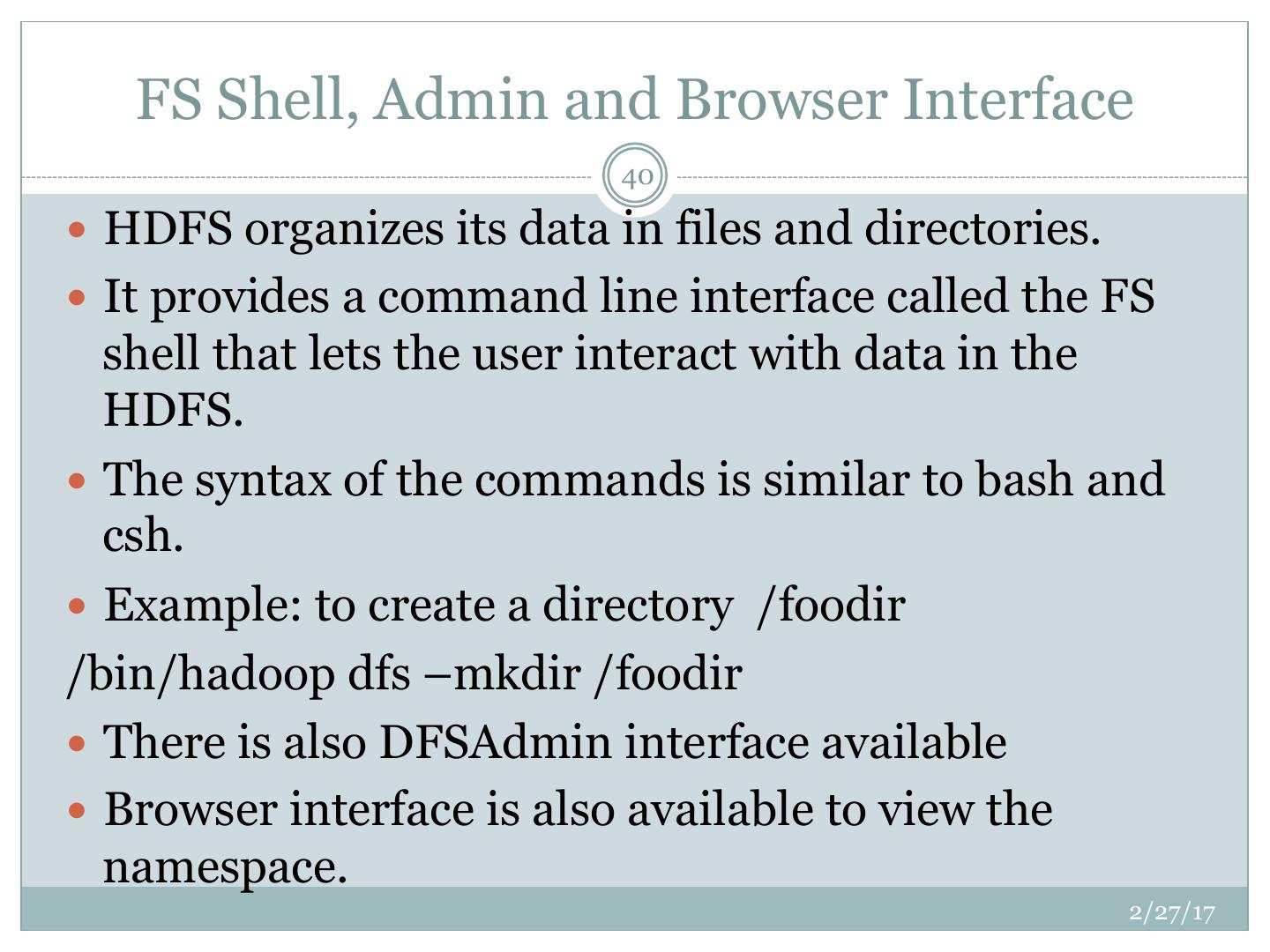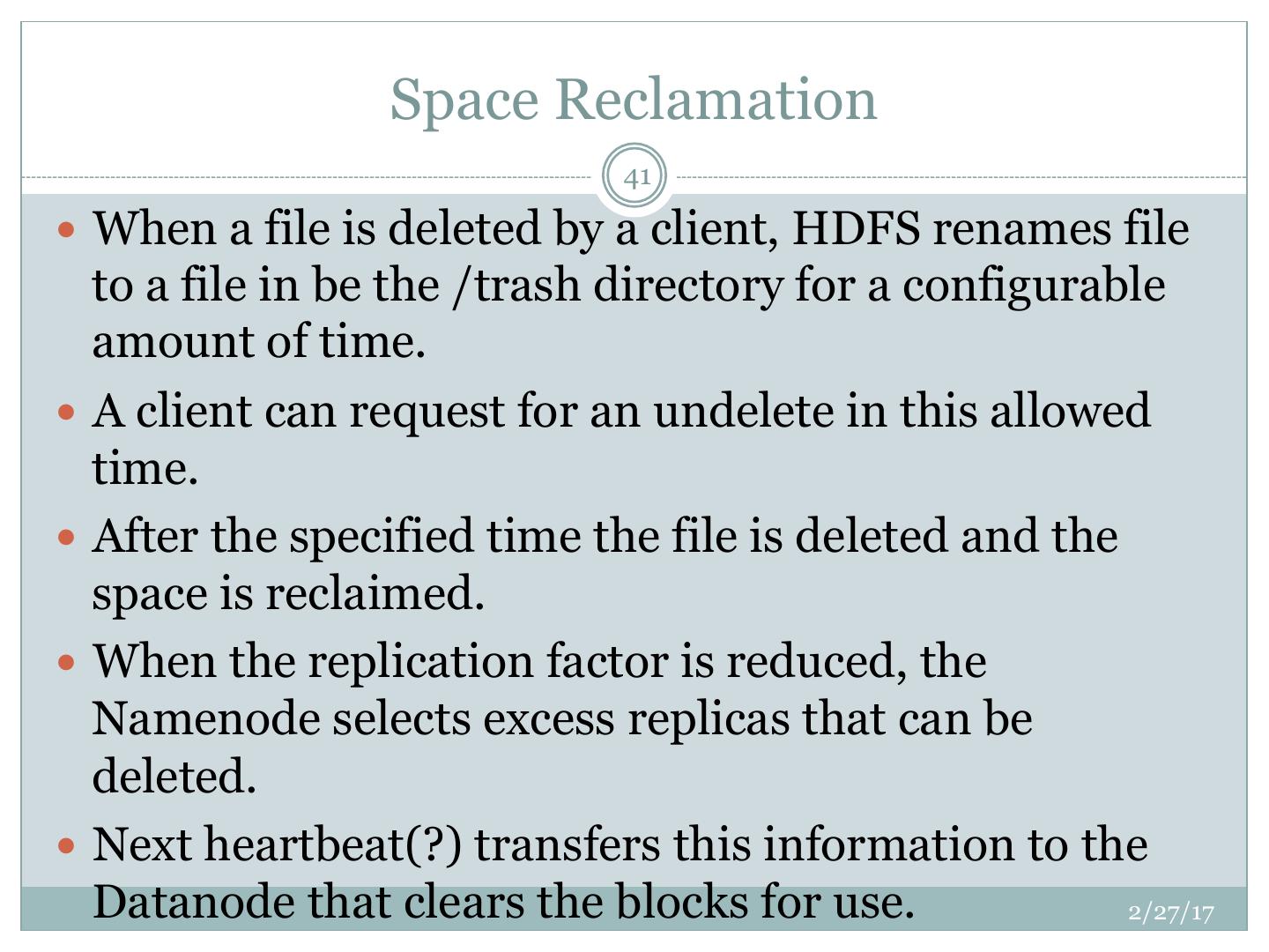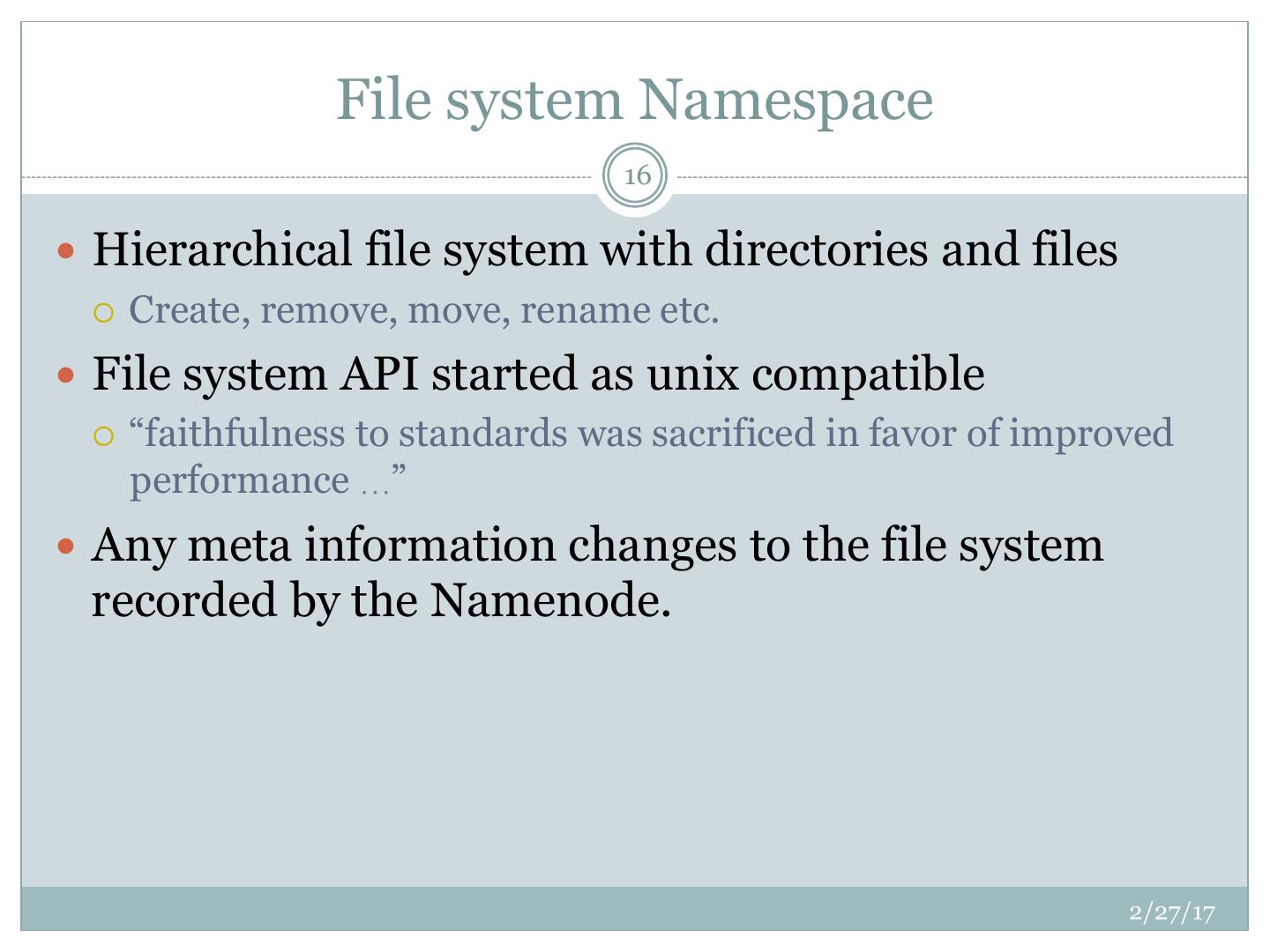 16 . File system Namespace 16 Hierarchical file system with directories and files ¡ Create, remove, move, rename etc. File system API started as unix compatible ¡ “faithfulness to standards was sacrificed in favor of improved performance …” Any meta information changes to the file system recorded by the Namenode. 2/27/17