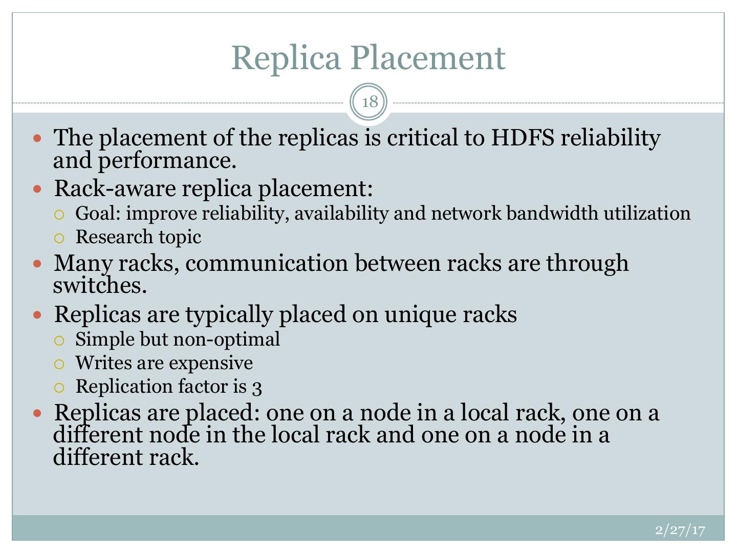 18 . Replica Placement 18 The placement of the replicas is critical to HDFS reliability and performance. Rack-aware replica placement: ¡ Goal: improve reliability, availability and network bandwidth utilization ¡ Research topic Many racks, communication between racks are through switches. Replicas are typically placed on unique racks ¡ Simple but non-optimal ¡ Writes are expensive ¡ Replication factor is 3 Replicas are placed: one on a node in a local rack, one on a different node in the local rack and one on a node in a different rack. 2/27/17