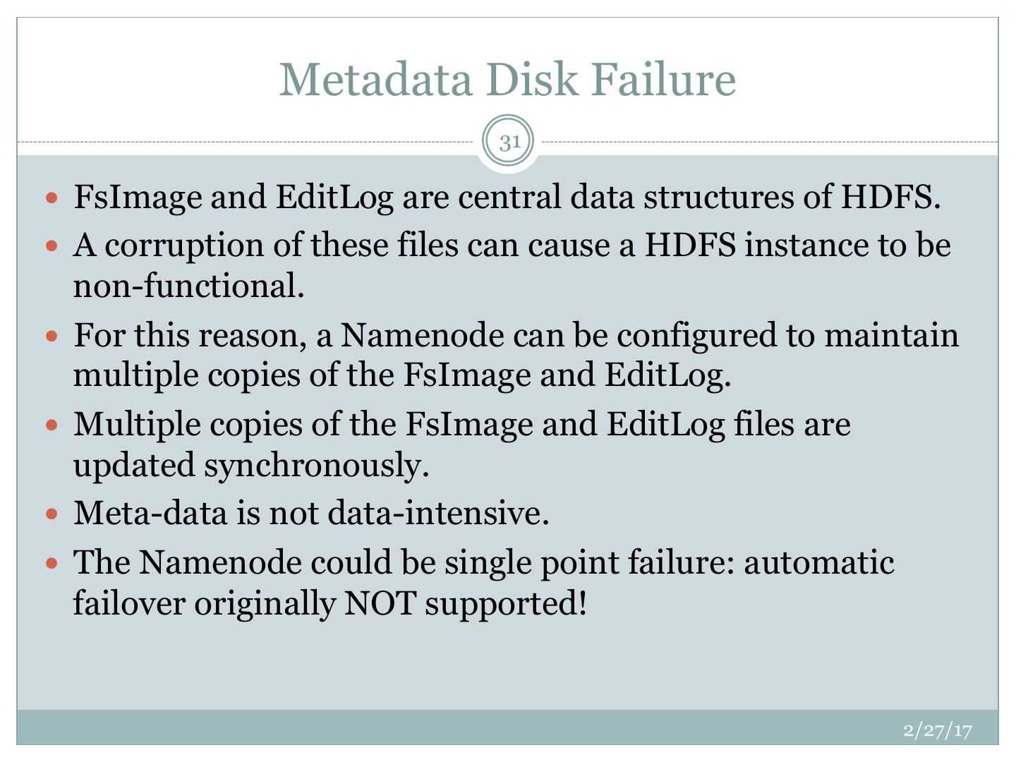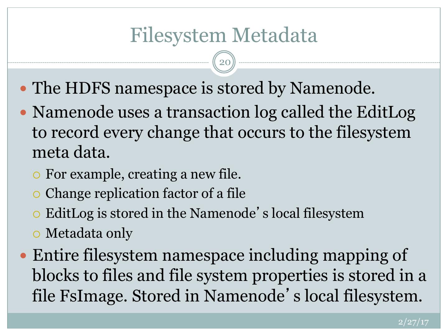 20 . Filesystem Metadata 20 The HDFS namespace is stored by Namenode. Namenode uses a transaction log called the EditLog to record every change that occurs to the filesystem meta data. ¡ For example, creating a new file. ¡ Change replication factor of a file ¡ EditLog is stored in the Namenode’s local filesystem ¡ Metadata only Entire filesystem namespace including mapping of blocks to files and file system properties is stored in a file FsImage. Stored in Namenode’s local filesystem. 2/27/17
