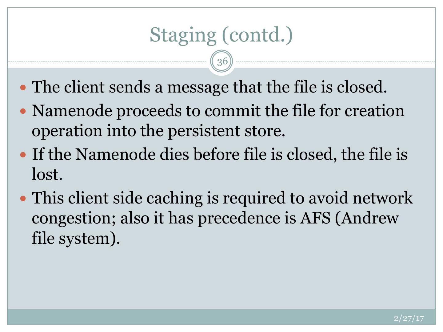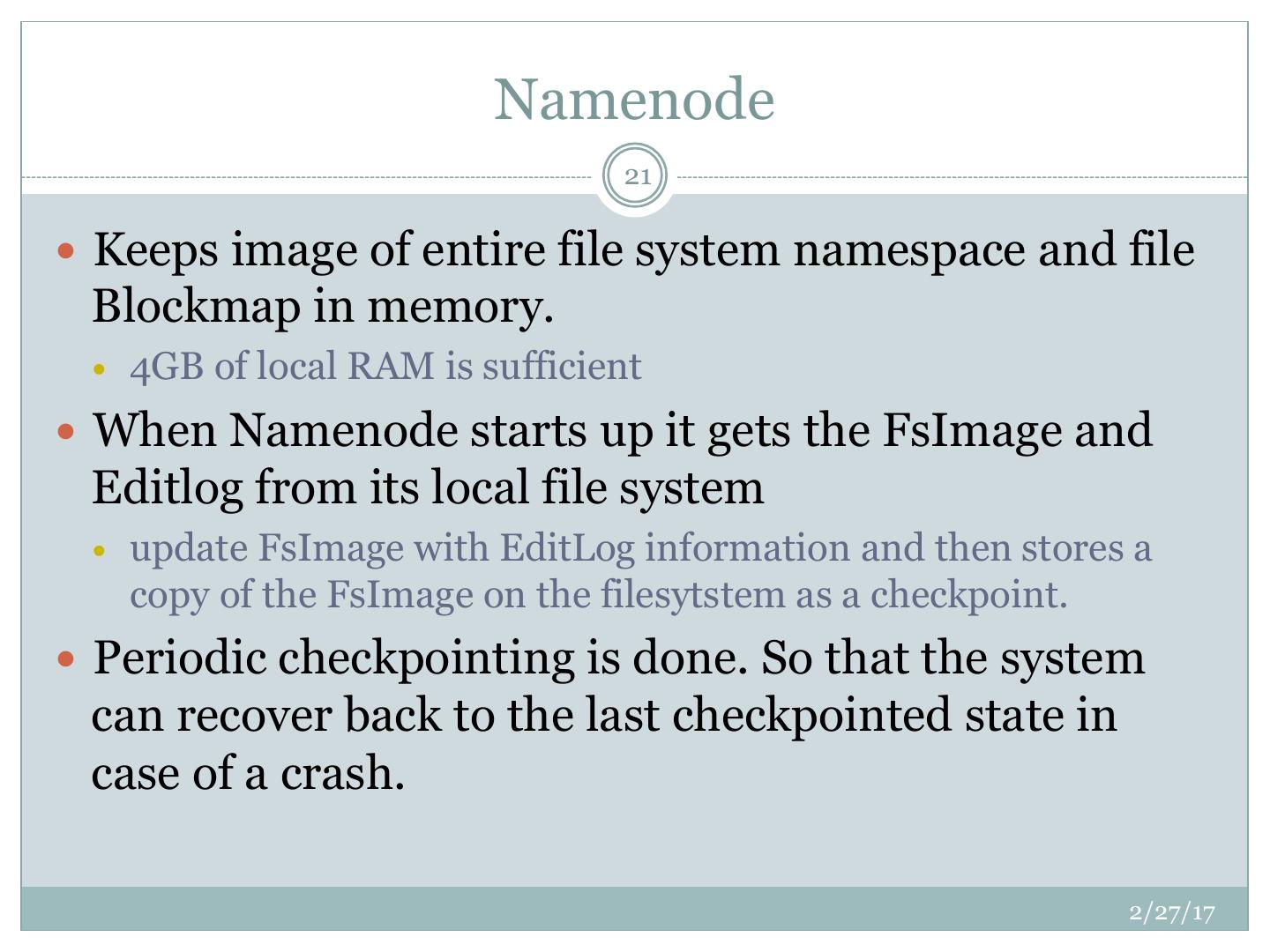 21 . Namenode 21 Keeps image of entire file system namespace and file Blockmap in memory. 4GB of local RAM is sufficient When Namenode starts up it gets the FsImage and Editlog from its local file system update FsImage with EditLog information and then stores a copy of the FsImage on the filesytstem as a checkpoint. Periodic checkpointing is done. So that the system can recover back to the last checkpointed state in case of a crash. 2/27/17