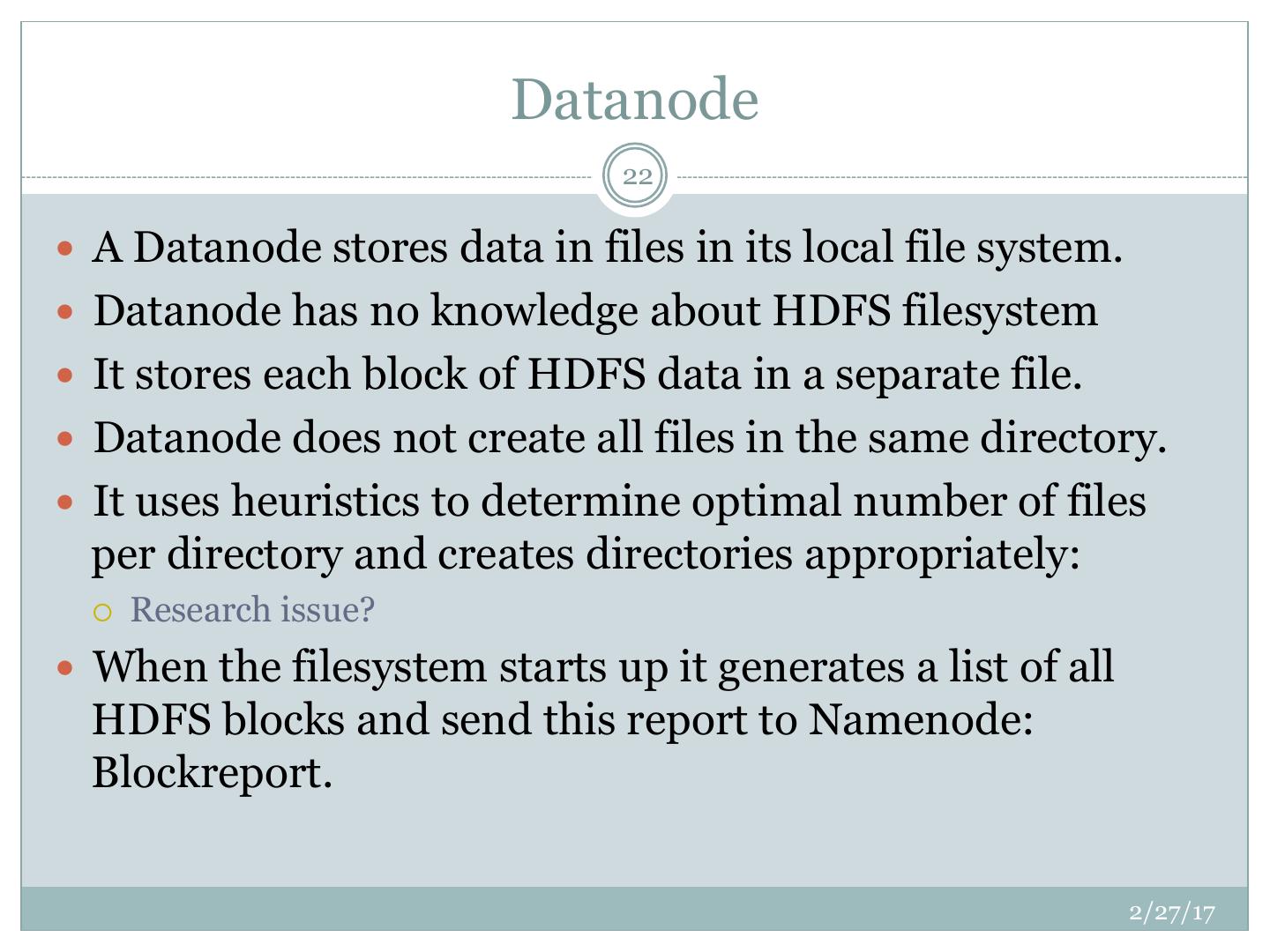 22 . Datanode 22 A Datanode stores data in files in its local file system. Datanode has no knowledge about HDFS filesystem It stores each block of HDFS data in a separate file. Datanode does not create all files in the same directory. It uses heuristics to determine optimal number of files per directory and creates directories appropriately: ¡ Research issue? When the filesystem starts up it generates a list of all HDFS blocks and send this report to Namenode: Blockreport. 2/27/17