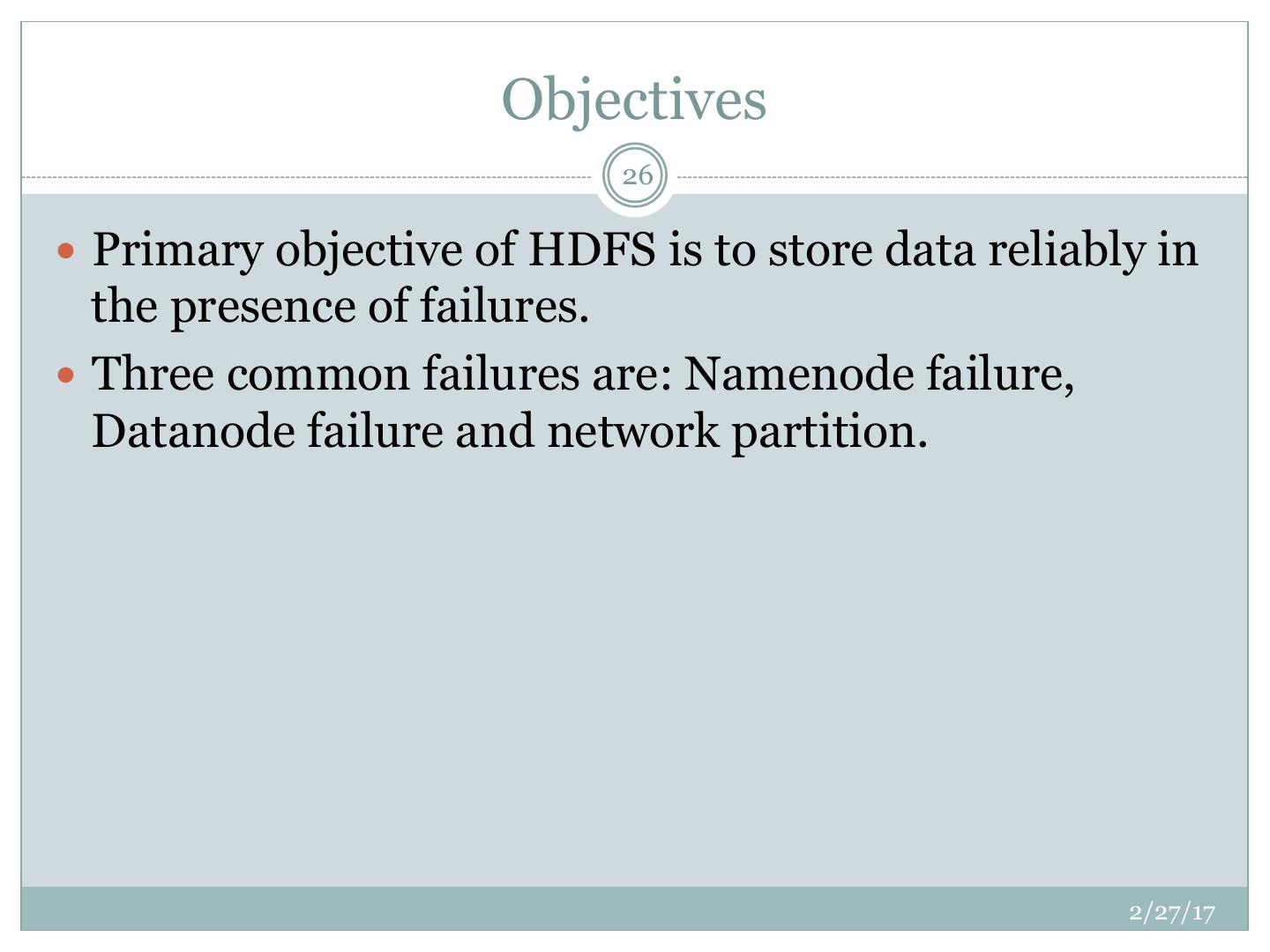 26 . Objectives 26 Primary objective of HDFS is to store data reliably in the presence of failures. Three common failures are: Namenode failure, Datanode failure and network partition. 2/27/17