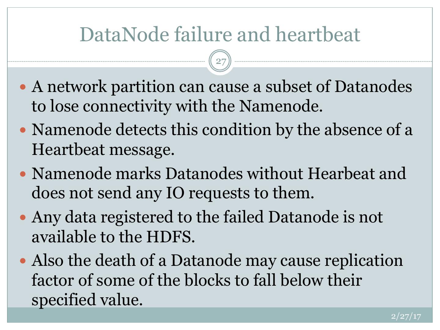 27 . DataNode failure and heartbeat 27 A network partition can cause a subset of Datanodes to lose connectivity with the Namenode. Namenode detects this condition by the absence of a Heartbeat message. Namenode marks Datanodes without Hearbeat and does not send any IO requests to them. Any data registered to the failed Datanode is not available to the HDFS. Also the death of a Datanode may cause replication factor of some of the blocks to fall below their specified value. 2/27/17
