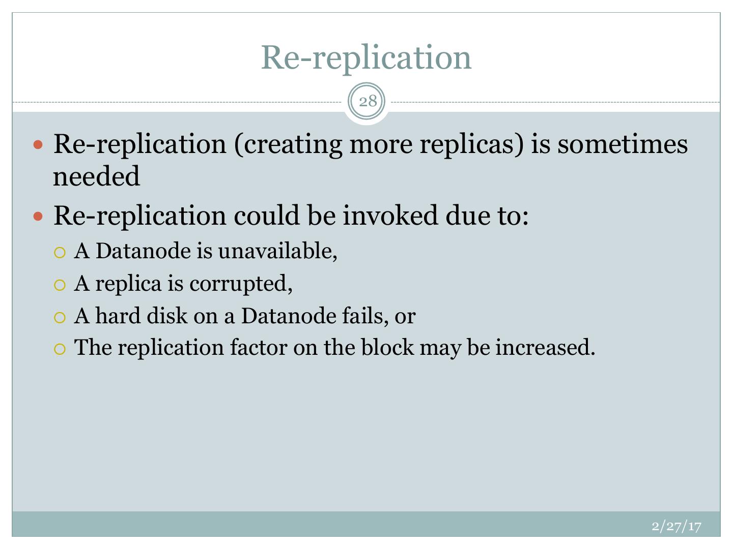 28 . Re-replication 28 Re-replication (creating more replicas) is sometimes needed Re-replication could be invoked due to: ¡ A Datanode is unavailable, ¡ A replica is corrupted, ¡ A hard disk on a Datanode fails, or ¡ The replication factor on the block may be increased. 2/27/17