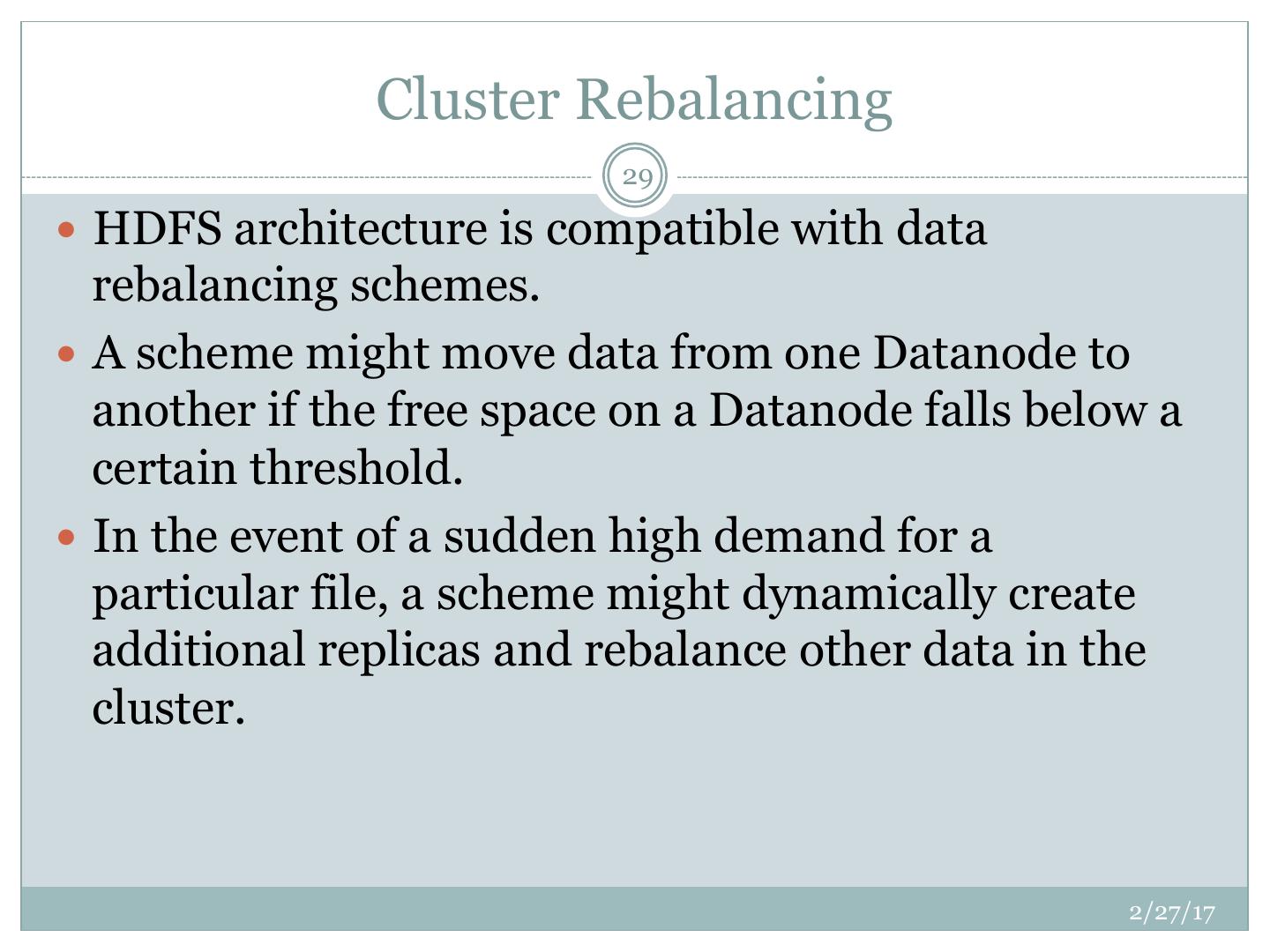 29 . Cluster Rebalancing 29 HDFS architecture is compatible with data rebalancing schemes. A scheme might move data from one Datanode to another if the free space on a Datanode falls below a certain threshold. In the event of a sudden high demand for a particular file, a scheme might dynamically create additional replicas and rebalance other data in the cluster. 2/27/17