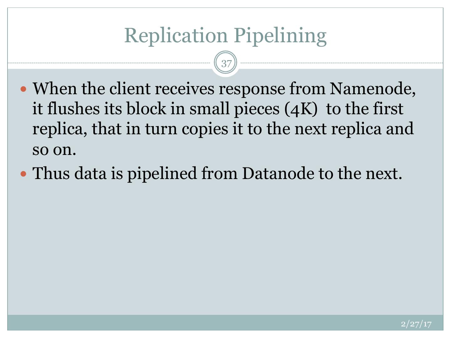 17 . Data Replication 17 HDFS is designed to store very large files across machines in a large cluster. Each file is a sequence of blocks. All blocks in the file except the last are of the same size. Blocks are replicated for fault tolerance. Block size and replicas are configurable per file. The Namenode receives a Heartbeat and a BlockReport from each DataNode in the cluster. BlockReport contains all the blocks on a Datanode. 2/27/17