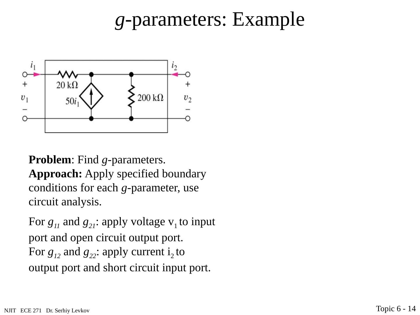 13 .NJIT ECE 271 Dr. Serhiy Levkov g -parameters Use open-circuit ( i = 0) and short-circuit ( v = 0) terminal conditions Open-circuit input conductance Reverse short-circuit current gain Forward open-circuit voltage gain Short-circuit output resistance If g 12 = 0 Norton transformation Topic 6 - 13