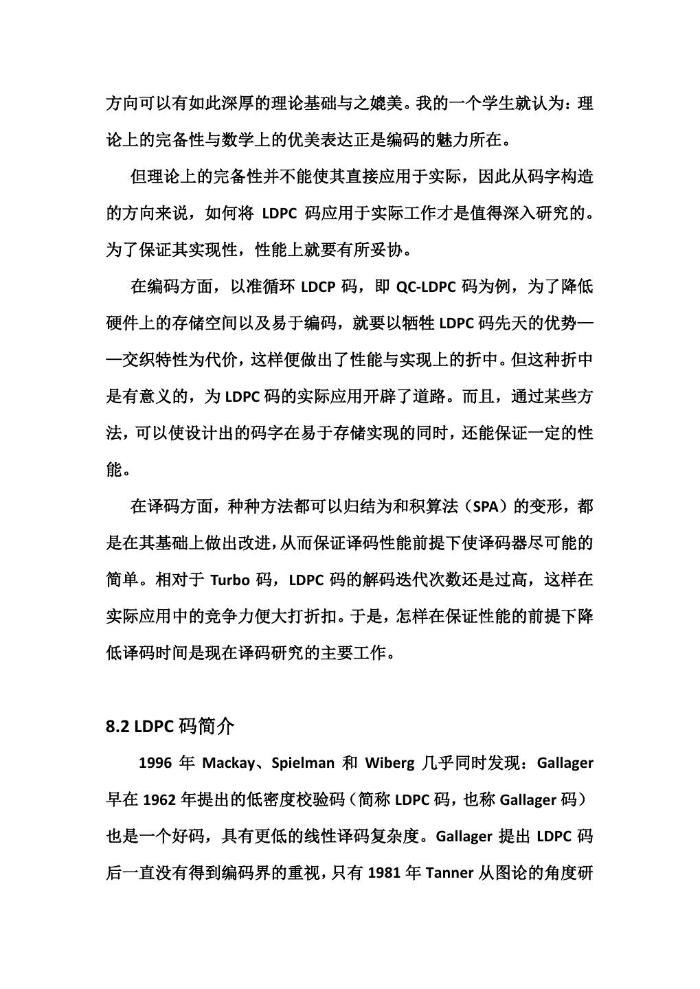 2 .方向可以有如此深厚的理论基础与之媲美。我的一个学生就认为:理 论上的完备性与数学上的优美表达正是编码的魅力所在。 但理论上的完备性并不能使其直接应用于实际,因此从码字构造 的方向来说,如何将 LDPC 码应用于实际工作才是值得深入研究的。 为了保证其实现性,性能上就要有所妥协。 在编码方面,以准循环 LDCP 码,即 QC-LDPC 码为例,为了降低 硬件上的存储空间以及易于编码,就要以牺牲 LDPC 码先天的优势— —交织特性为代价,这样便做出了性能与实现上的折中。但这种折中 是有意义的,为 LDPC 码的实际应用开辟了道路。而且,通过某些方 法,可以使设计出的码字在易于存储实现的同时,还能保证一定的性 能。 在译码方面,种种方法都可以归结为和积算法(SPA)的变形,都 是在其基础上做出改进,从而保证译码性能前提下使译码器尽可能的 简单。相对于 Turbo 码,LDPC 码的解码迭代次数还是过高,这样在 实际应用中的竞争力便大打折扣。于是,怎样在保证性能的前提下降 低译码时间是现在译码研究的主要工作。 8.2 LDPC 码简介 1996 年 Mackay、Spielman 和 Wiberg 几乎同时发现:Gallager 早在 1962 年提出的低密度校验码(简称 LDPC 码,也称 Gallager 码) 也是一个好码,具有更低的线性译码复杂度。Gallager 提出 LDPC 码 后一直没有得到编码界的重视,只有 1981 年 Tanner 从图论的角度研